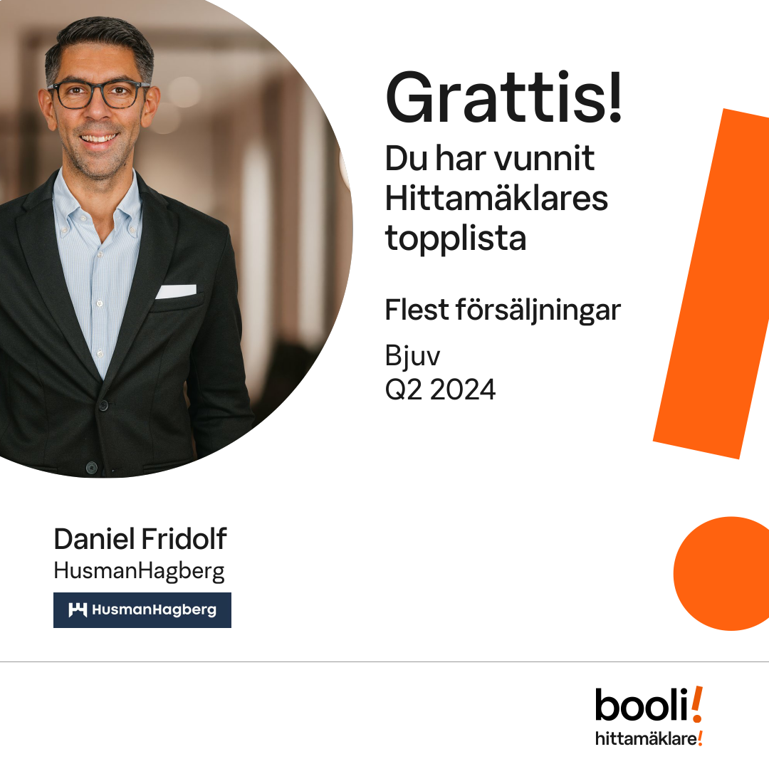 Statistik för publicerade bostäder, försäljningar och omdömen baseras på data från Booli och Hittamäklare. Statistiken för försäljningar avser inrapporterade och verifierade slutpriser från mäklare eller av Booli inhämtade och verifierade slutpriser. Statistiken för publicerade bostäder baseras på information som publicerats på Booli.se. Statistik för omdömen och rekommendationer baseras på omdömen från säljare som lämnats via Booli och Hittamäklare.