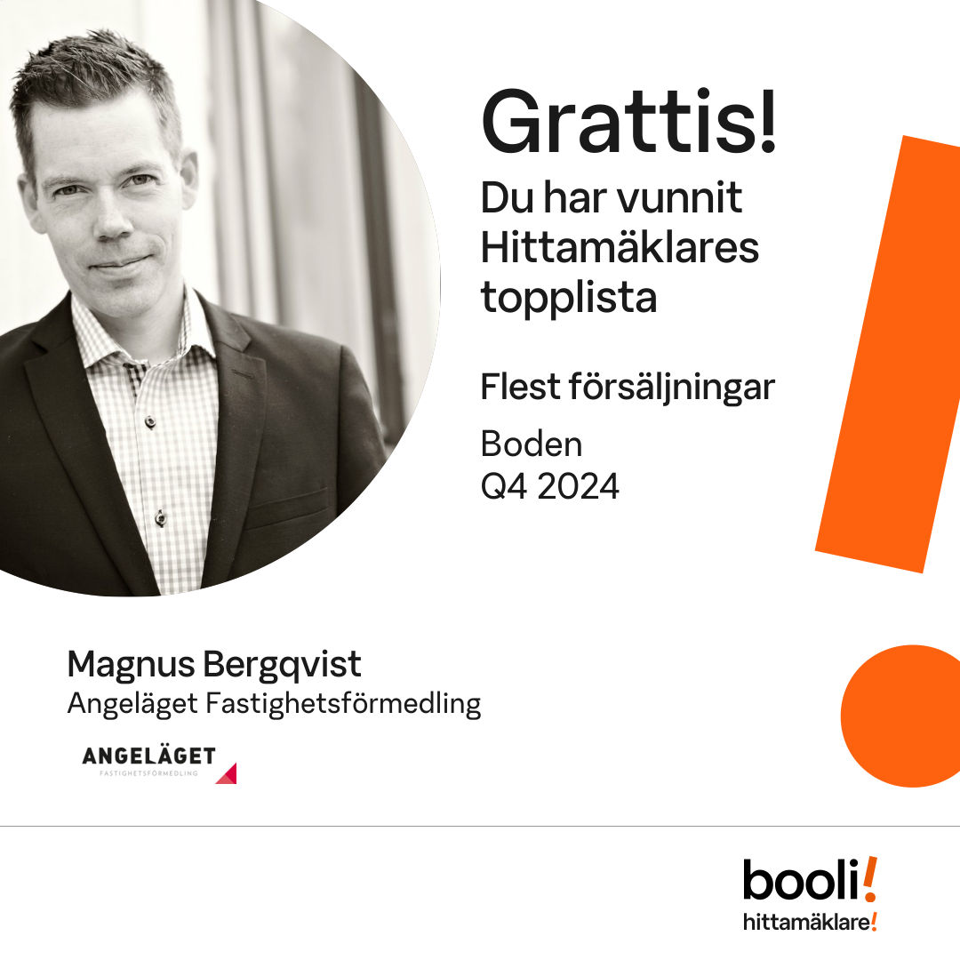 Statistik för publicerade bostäder, försäljningar och omdömen baseras på data från Booli och Hittamäklare. Statistiken för försäljningar avser inrapporterade och verifierade slutpriser från mäklare eller av Booli inhämtade och verifierade slutpriser. Statistiken för publicerade bostäder baseras på information som publicerats på Booli.se. Statistik för omdömen och rekommendationer baseras på omdömen från säljare som lämnats via Booli och Hittamäklare.