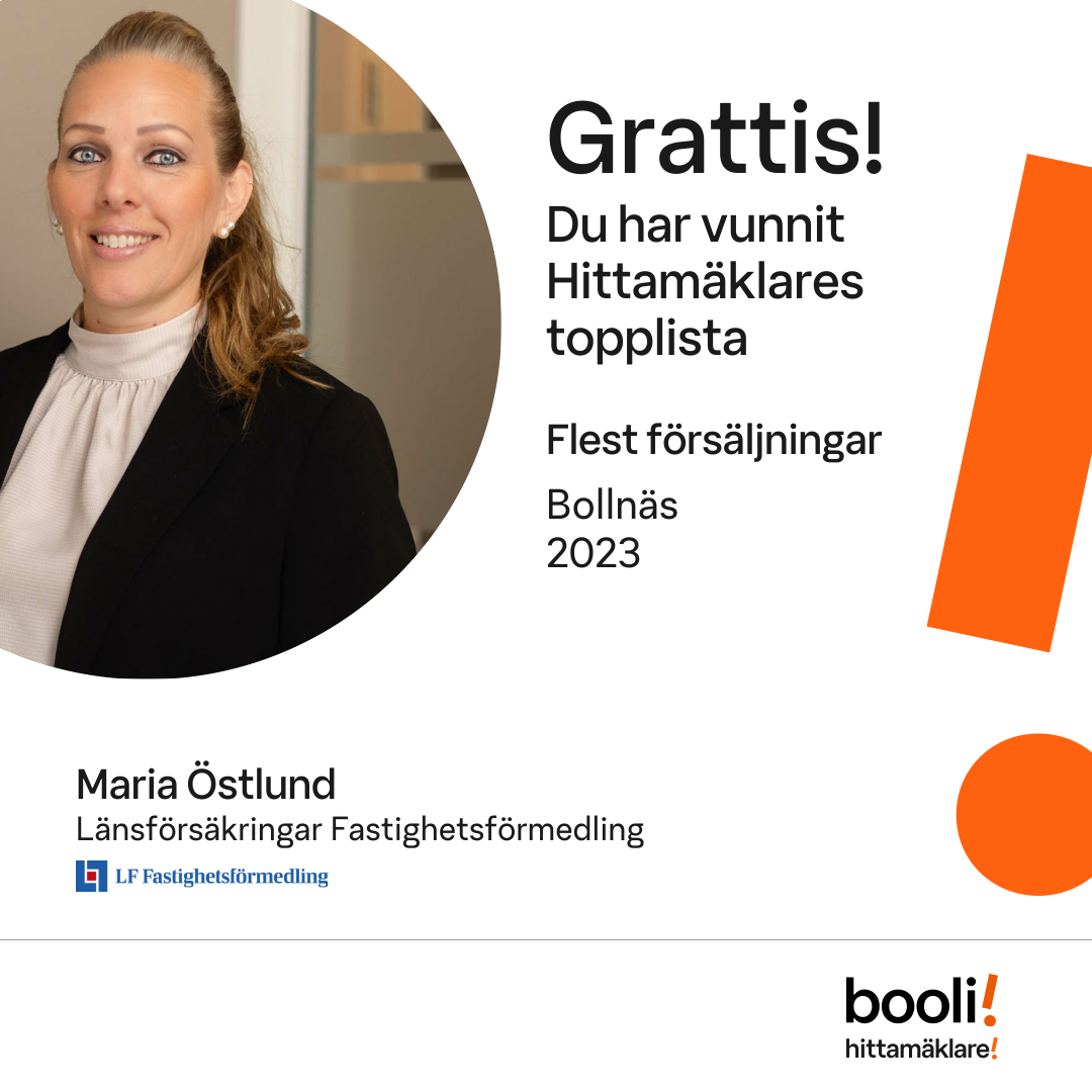 Statistik för publicerade bostäder, försäljningar och omdömen baseras på data från Booli och Hittamäklare. Statistiken för försäljningar avser inrapporterade och verifierade slutpriser från mäklare eller av Booli inhämtade och verifierade slutpriser. Statistiken för publicerade bostäder baseras på information som publicerats på Booli.se. Statistik för omdömen och rekommendationer baseras på omdömen från säljare som lämnats via Booli och Hittamäklare.