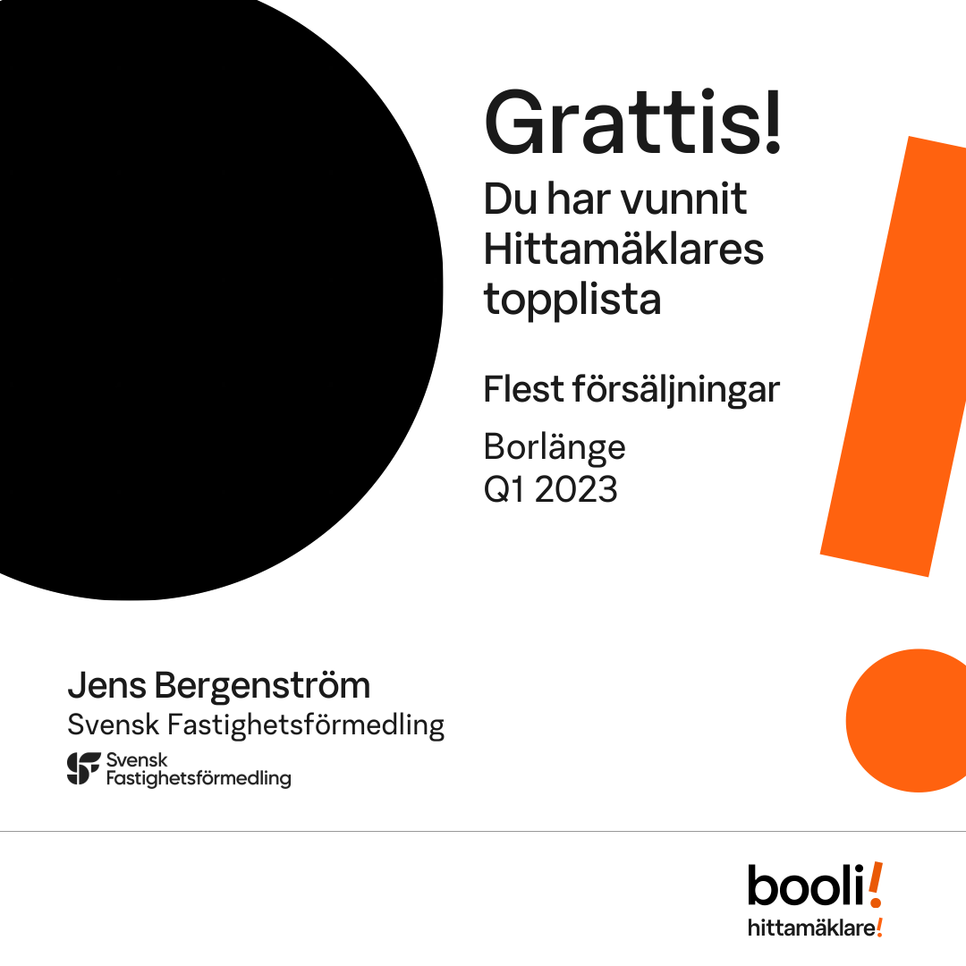 Statistik för publicerade bostäder, försäljningar och omdömen baseras på data från Booli och Hittamäklare. Statistiken för försäljningar avser inrapporterade och verifierade slutpriser från mäklare eller av Booli inhämtade och verifierade slutpriser. Statistiken för publicerade bostäder baseras på information som publicerats på Booli.se. Statistik för omdömen och rekommendationer baseras på omdömen från säljare som lämnats via Booli och Hittamäklare.