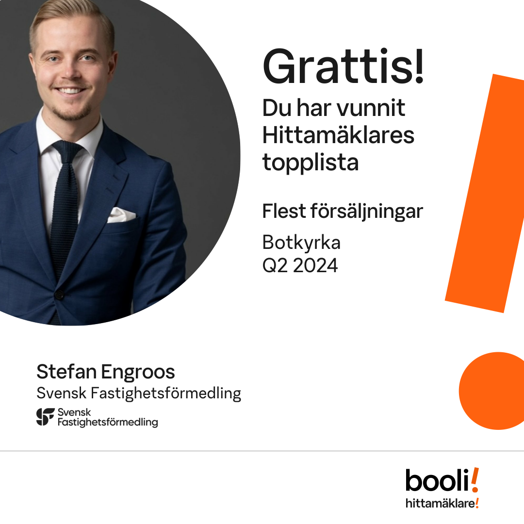 Statistik för publicerade bostäder, försäljningar och omdömen baseras på data från Booli och Hittamäklare. Statistiken för försäljningar avser inrapporterade och verifierade slutpriser från mäklare eller av Booli inhämtade och verifierade slutpriser. Statistiken för publicerade bostäder baseras på information som publicerats på Booli.se. Statistik för omdömen och rekommendationer baseras på omdömen från säljare som lämnats via Booli och Hittamäklare.