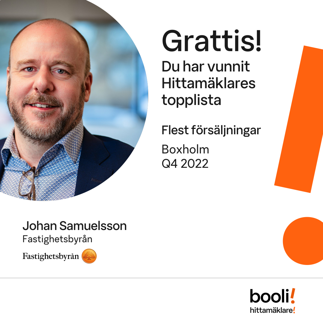 Statistik för publicerade bostäder, försäljningar och omdömen baseras på data från Booli och Hittamäklare. Statistiken för försäljningar avser inrapporterade och verifierade slutpriser från mäklare eller av Booli inhämtade och verifierade slutpriser. Statistiken för publicerade bostäder baseras på information som publicerats på Booli.se. Statistik för omdömen och rekommendationer baseras på omdömen från säljare som lämnats via Booli och Hittamäklare.