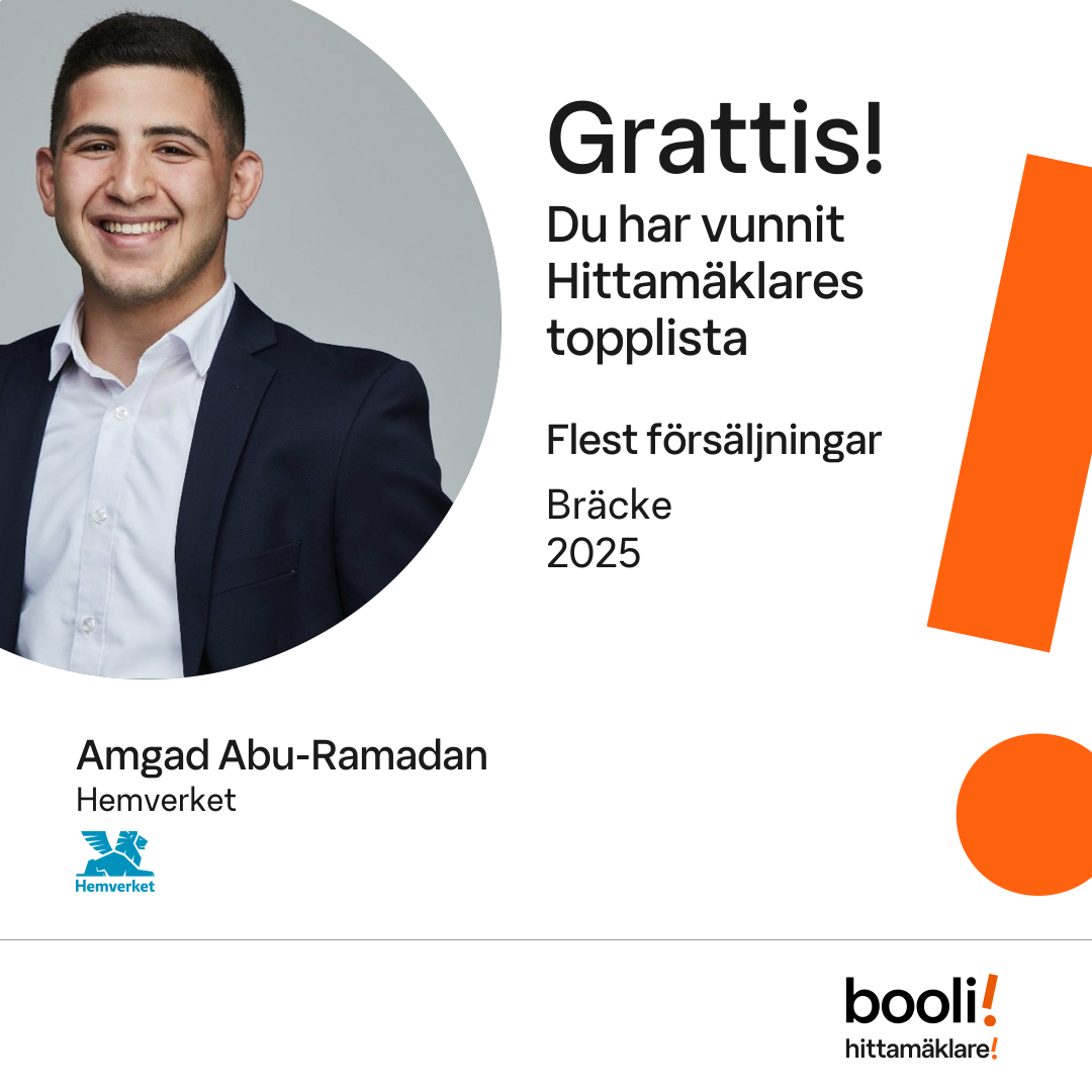Statistik för publicerade bostäder, försäljningar och omdömen baseras på data från Booli och Hittamäklare. Statistiken för försäljningar avser inrapporterade och verifierade slutpriser från mäklare eller av Booli inhämtade och verifierade slutpriser. Statistiken för publicerade bostäder baseras på information som publicerats på Booli.se. Statistik för omdömen och rekommendationer baseras på omdömen från säljare som lämnats via Booli och Hittamäklare.