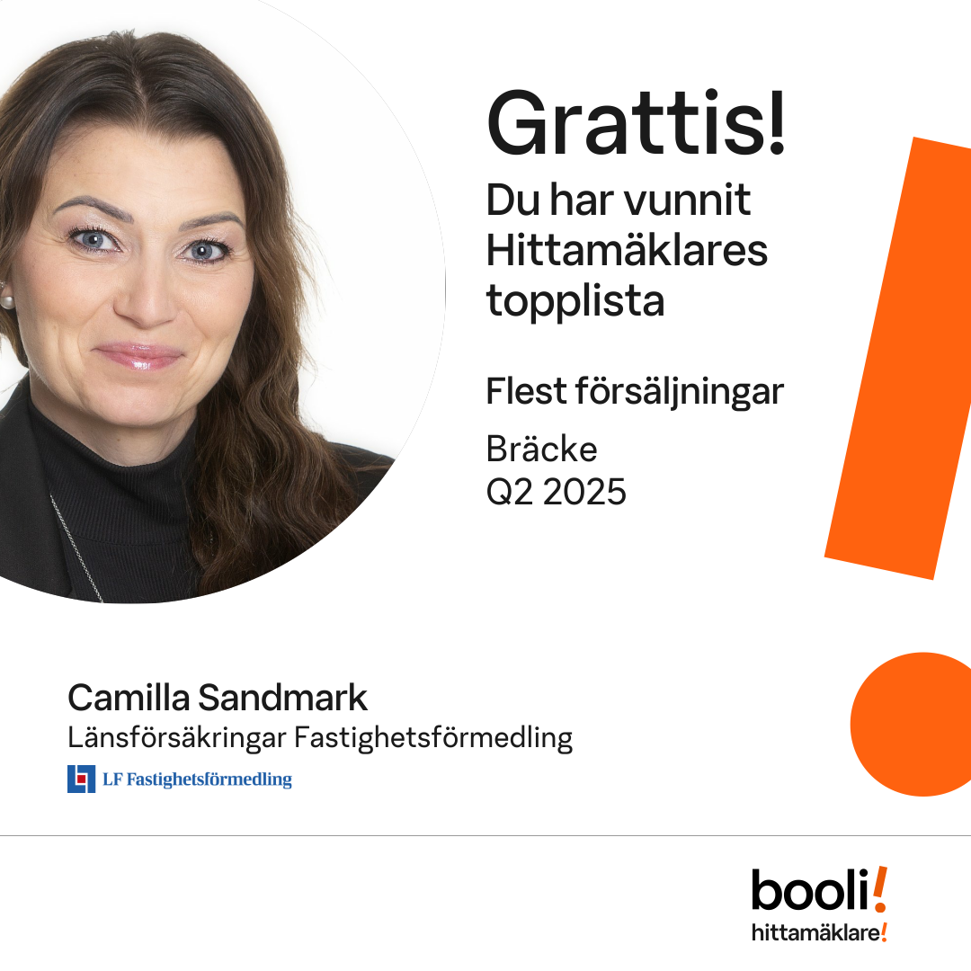 Statistik för publicerade bostäder, försäljningar och omdömen baseras på data från Booli och Hittamäklare. Statistiken för försäljningar avser inrapporterade och verifierade slutpriser från mäklare eller av Booli inhämtade och verifierade slutpriser. Statistiken för publicerade bostäder baseras på information som publicerats på Booli.se. Statistik för omdömen och rekommendationer baseras på omdömen från säljare som lämnats via Booli och Hittamäklare.