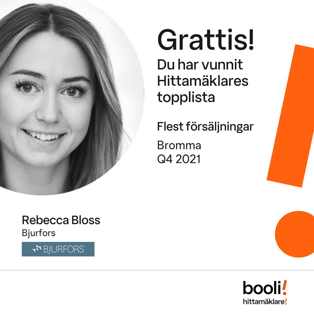 Statistik för publicerade bostäder, försäljningar och omdömen baseras på data från Booli och Hittamäklare. Statistiken för försäljningar avser inrapporterade och verifierade slutpriser från mäklare eller av Booli inhämtade och verifierade slutpriser. Statistiken för publicerade bostäder baseras på information som publicerats på Booli.se. Statistik för omdömen och rekommendationer baseras på omdömen från säljare som lämnats via Booli och Hittamäklare.