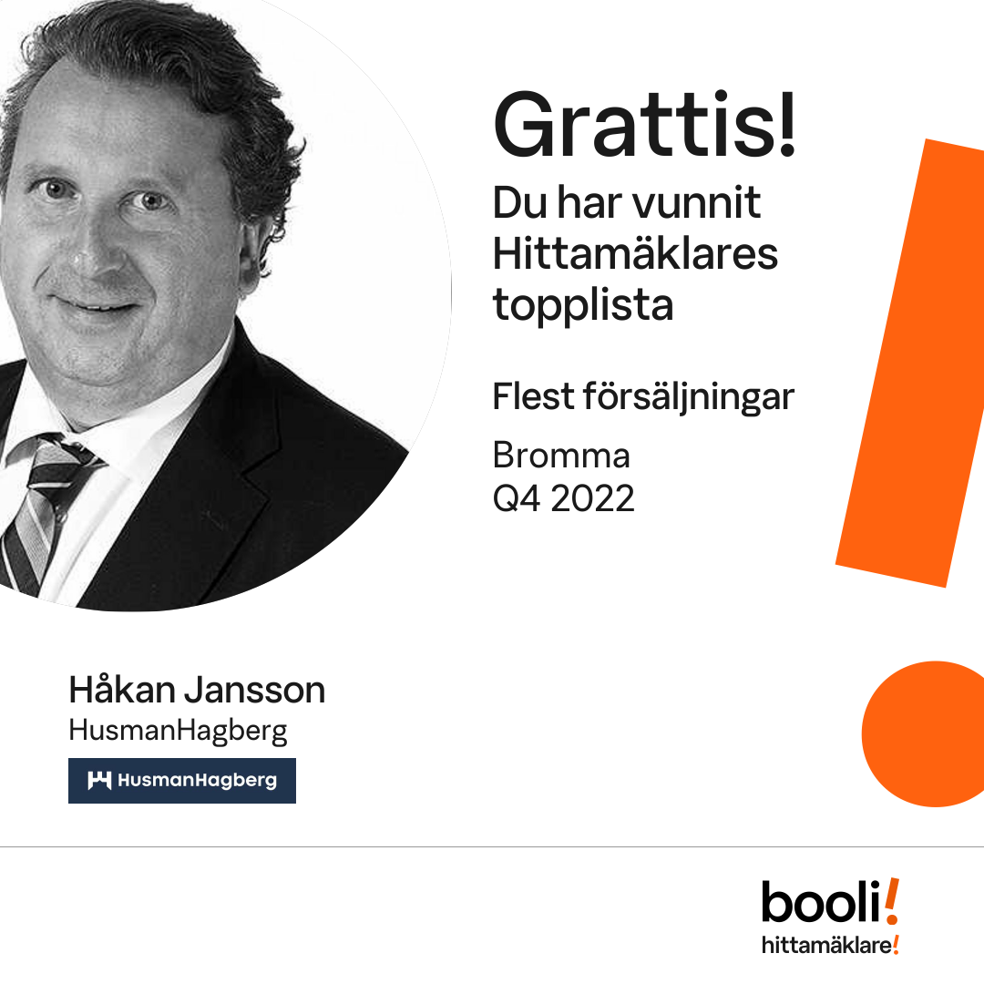 Statistik för publicerade bostäder, försäljningar och omdömen baseras på data från Booli och Hittamäklare. Statistiken för försäljningar avser inrapporterade och verifierade slutpriser från mäklare eller av Booli inhämtade och verifierade slutpriser. Statistiken för publicerade bostäder baseras på information som publicerats på Booli.se. Statistik för omdömen och rekommendationer baseras på omdömen från säljare som lämnats via Booli och Hittamäklare.