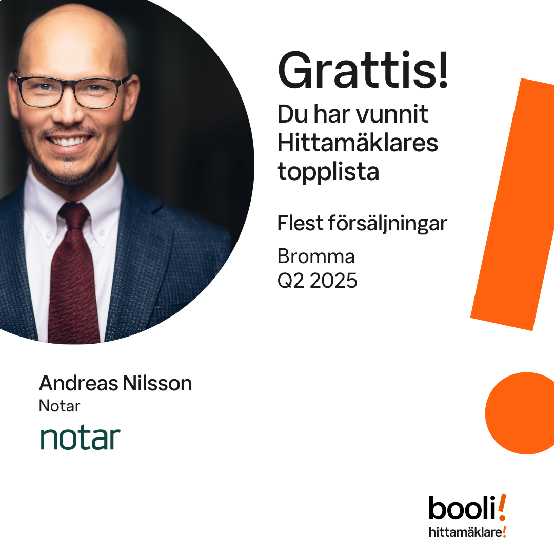 Statistik för publicerade bostäder, försäljningar och omdömen baseras på data från Booli och Hittamäklare. Statistiken för försäljningar avser inrapporterade och verifierade slutpriser från mäklare eller av Booli inhämtade och verifierade slutpriser. Statistiken för publicerade bostäder baseras på information som publicerats på Booli.se. Statistik för omdömen och rekommendationer baseras på omdömen från säljare som lämnats via Booli och Hittamäklare.