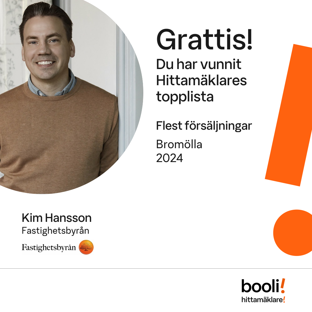 Statistik för publicerade bostäder, försäljningar och omdömen baseras på data från Booli och Hittamäklare. Statistiken för försäljningar avser inrapporterade och verifierade slutpriser från mäklare eller av Booli inhämtade och verifierade slutpriser. Statistiken för publicerade bostäder baseras på information som publicerats på Booli.se. Statistik för omdömen och rekommendationer baseras på omdömen från säljare som lämnats via Booli och Hittamäklare.
