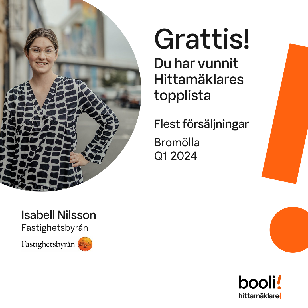 Statistik för publicerade bostäder, försäljningar och omdömen baseras på data från Booli och Hittamäklare. Statistiken för försäljningar avser inrapporterade och verifierade slutpriser från mäklare eller av Booli inhämtade och verifierade slutpriser. Statistiken för publicerade bostäder baseras på information som publicerats på Booli.se. Statistik för omdömen och rekommendationer baseras på omdömen från säljare som lämnats via Booli och Hittamäklare.
