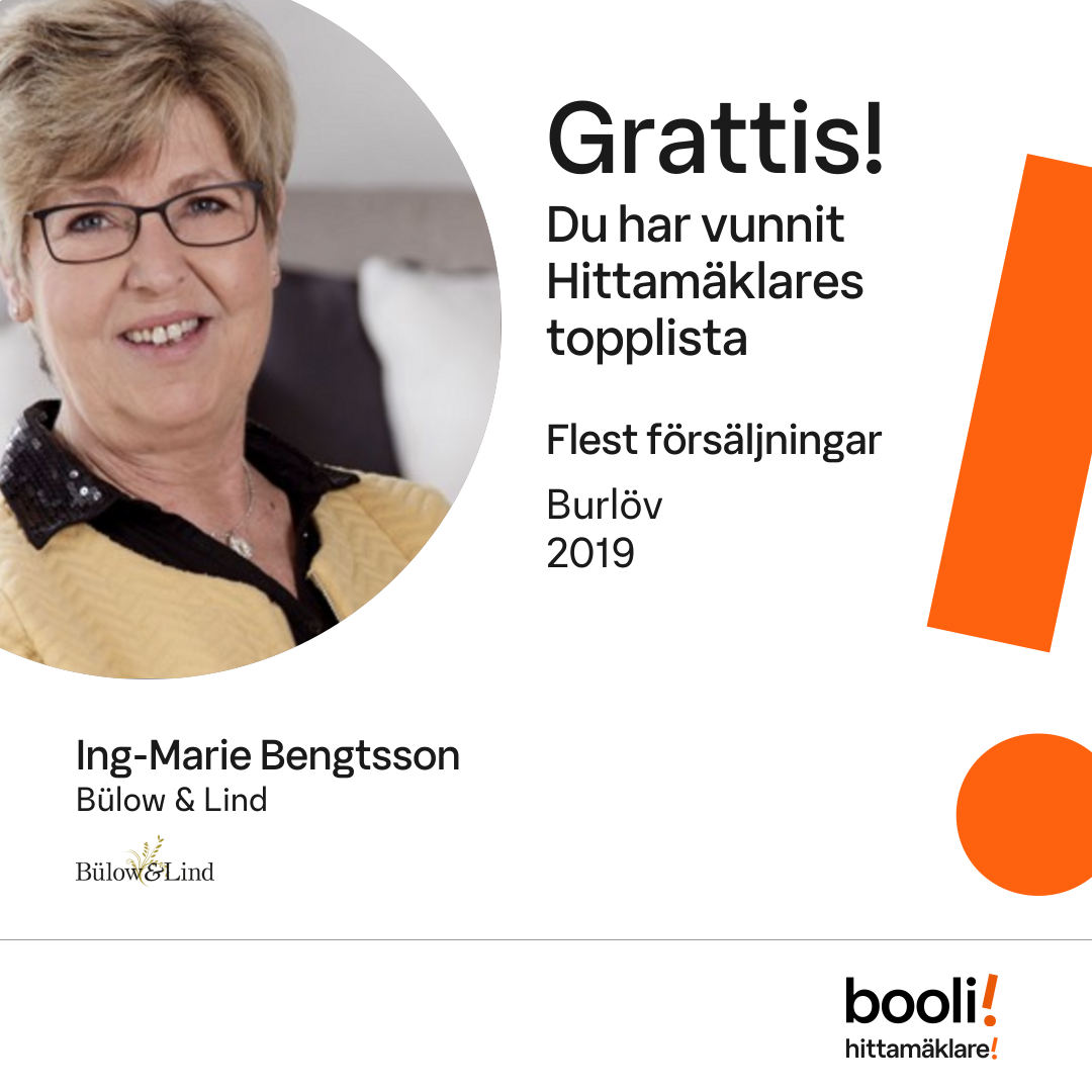 Statistik för publicerade bostäder, försäljningar och omdömen baseras på data från Booli och Hittamäklare. Statistiken för försäljningar avser inrapporterade och verifierade slutpriser från mäklare eller av Booli inhämtade och verifierade slutpriser. Statistiken för publicerade bostäder baseras på information som publicerats på Booli.se. Statistik för omdömen och rekommendationer baseras på omdömen från säljare som lämnats via Booli och Hittamäklare.