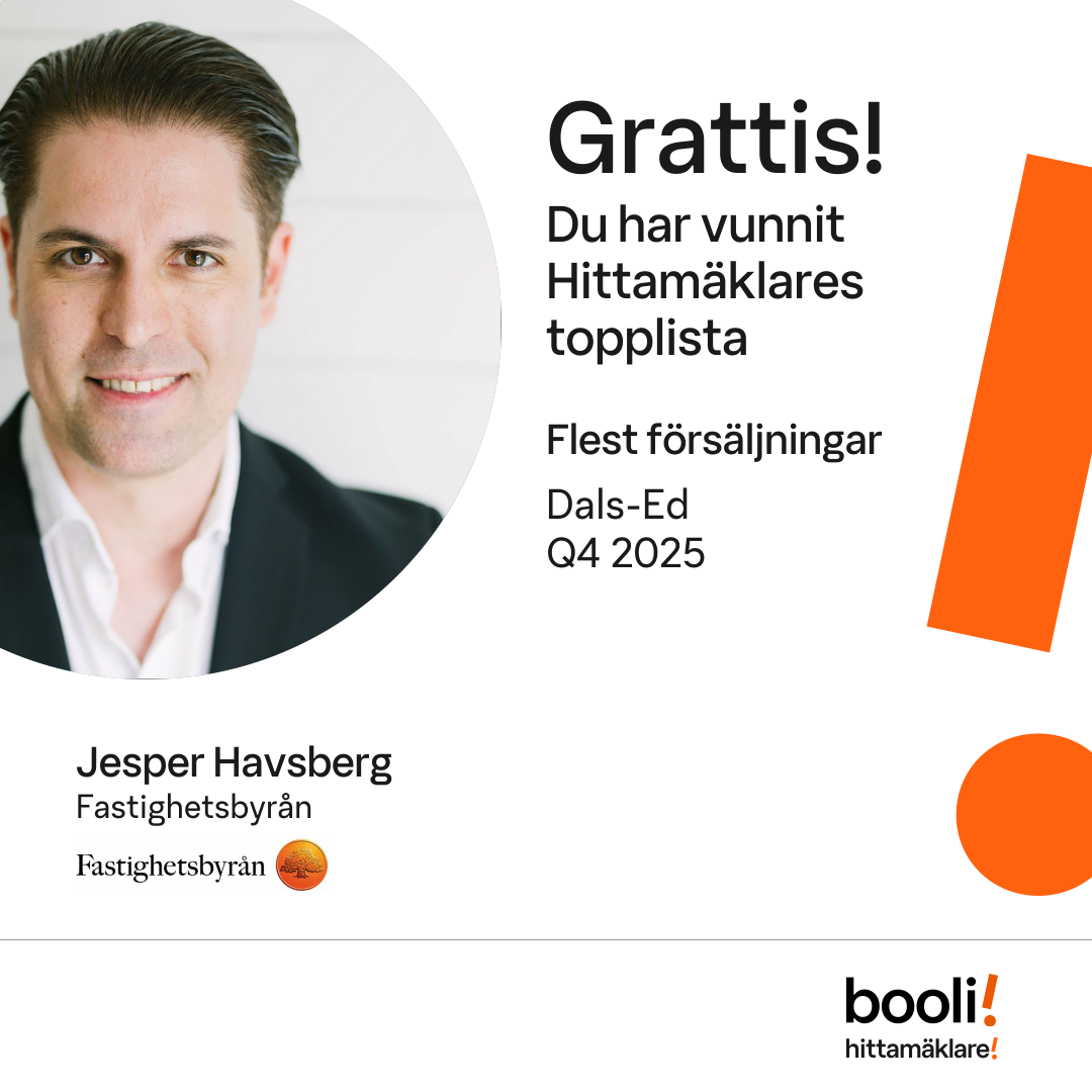 Statistik för publicerade bostäder, försäljningar och omdömen baseras på data från Booli och Hittamäklare. Statistiken för försäljningar avser inrapporterade och verifierade slutpriser från mäklare eller av Booli inhämtade och verifierade slutpriser. Statistiken för publicerade bostäder baseras på information som publicerats på Booli.se. Statistik för omdömen och rekommendationer baseras på omdömen från säljare som lämnats via Booli och Hittamäklare.
