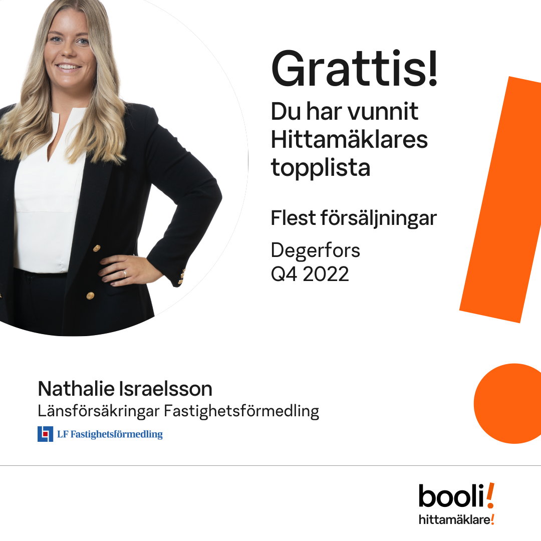 Statistik för publicerade bostäder, försäljningar och omdömen baseras på data från Booli och Hittamäklare. Statistiken för försäljningar avser inrapporterade och verifierade slutpriser från mäklare eller av Booli inhämtade och verifierade slutpriser. Statistiken för publicerade bostäder baseras på information som publicerats på Booli.se. Statistik för omdömen och rekommendationer baseras på omdömen från säljare som lämnats via Booli och Hittamäklare.