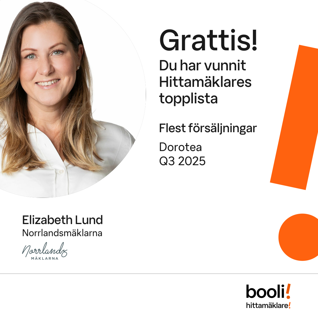 Statistik för publicerade bostäder, försäljningar och omdömen baseras på data från Booli. Statistiken för försäljningar avser inrapporterade och verifierade slutpriser från mäklare eller av Booli inhämtade och verifierade slutpriser. Statistiken för publicerade bostäder baseras på information som publicerats på Booli.se. Statistik för omdömen och rekommendationer baseras på omdömen från säljare som lämnats via Booli.