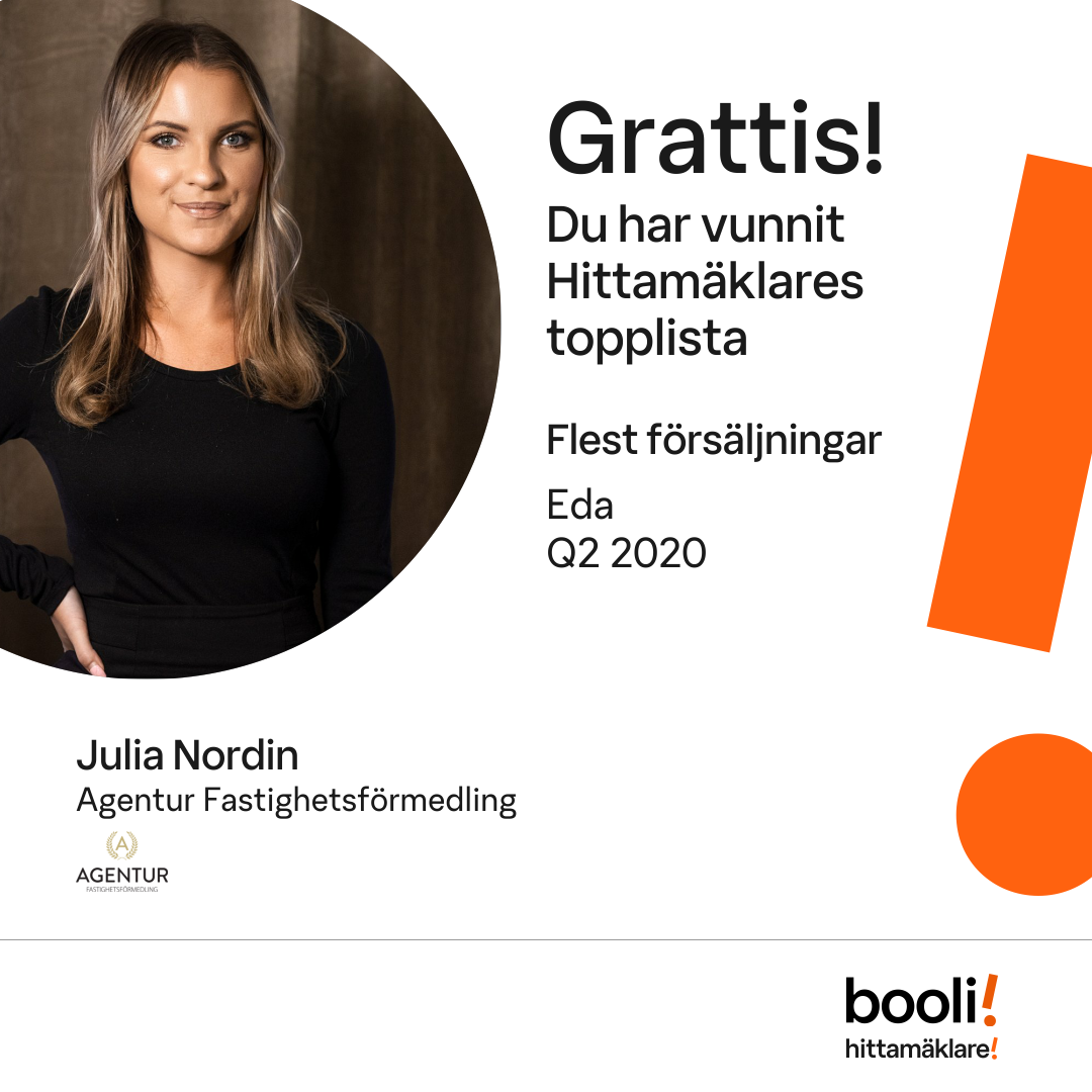 Statistik för publicerade bostäder, försäljningar och omdömen baseras på data från Booli och Hittamäklare. Statistiken för försäljningar avser inrapporterade och verifierade slutpriser från mäklare eller av Booli inhämtade och verifierade slutpriser. Statistiken för publicerade bostäder baseras på information som publicerats på Booli.se. Statistik för omdömen och rekommendationer baseras på omdömen från säljare som lämnats via Booli och Hittamäklare.