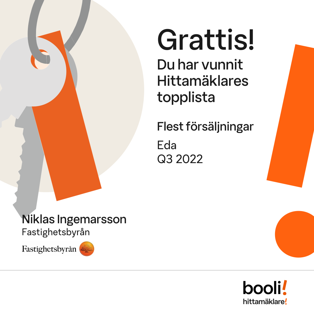 Statistik för publicerade bostäder, försäljningar och omdömen baseras på data från Booli och Hittamäklare. Statistiken för försäljningar avser inrapporterade och verifierade slutpriser från mäklare eller av Booli inhämtade och verifierade slutpriser. Statistiken för publicerade bostäder baseras på information som publicerats på Booli.se. Statistik för omdömen och rekommendationer baseras på omdömen från säljare som lämnats via Booli och Hittamäklare.