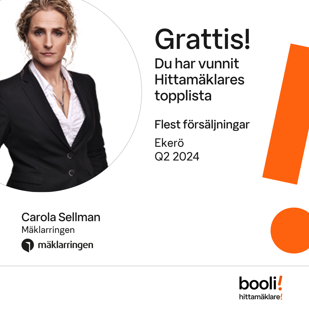 Statistik för publicerade bostäder, försäljningar och omdömen baseras på data från Booli och Hittamäklare. Statistiken för försäljningar avser inrapporterade och verifierade slutpriser från mäklare eller av Booli inhämtade och verifierade slutpriser. Statistiken för publicerade bostäder baseras på information som publicerats på Booli.se. Statistik för omdömen och rekommendationer baseras på omdömen från säljare som lämnats via Booli och Hittamäklare.