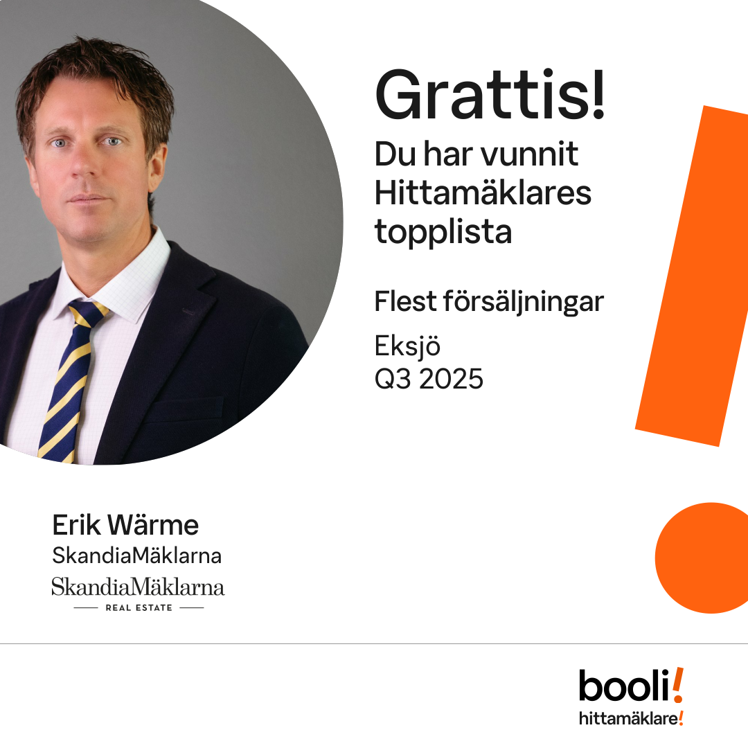 Statistik för publicerade bostäder, försäljningar och omdömen baseras på data från Booli och Hittamäklare. Statistiken för försäljningar avser inrapporterade och verifierade slutpriser från mäklare eller av Booli inhämtade och verifierade slutpriser. Statistiken för publicerade bostäder baseras på information som publicerats på Booli.se. Statistik för omdömen och rekommendationer baseras på omdömen från säljare som lämnats via Booli och Hittamäklare.