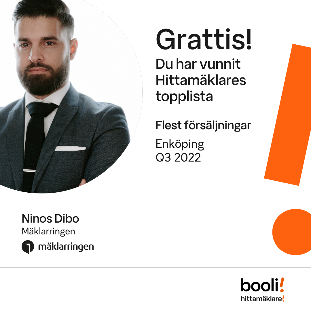 Statistik för publicerade bostäder, försäljningar och omdömen baseras på data från Booli och Hittamäklare. Statistiken för försäljningar avser inrapporterade och verifierade slutpriser från mäklare eller av Booli inhämtade och verifierade slutpriser. Statistiken för publicerade bostäder baseras på information som publicerats på Booli.se. Statistik för omdömen och rekommendationer baseras på omdömen från säljare som lämnats via Booli och Hittamäklare.