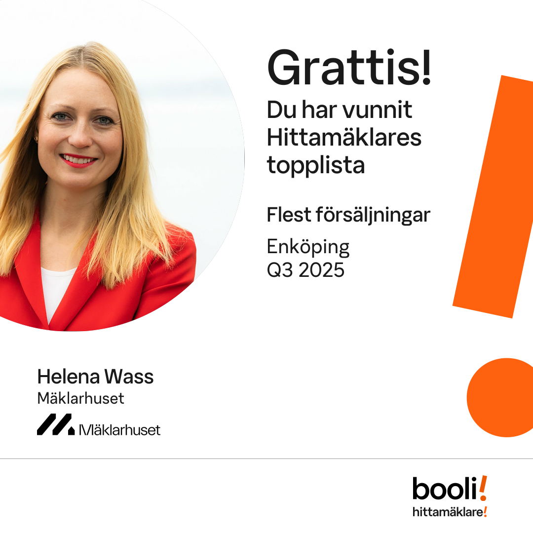 Statistik för publicerade bostäder, försäljningar och omdömen baseras på data från Booli och Hittamäklare. Statistiken för försäljningar avser inrapporterade och verifierade slutpriser från mäklare eller av Booli inhämtade och verifierade slutpriser. Statistiken för publicerade bostäder baseras på information som publicerats på Booli.se. Statistik för omdömen och rekommendationer baseras på omdömen från säljare som lämnats via Booli och Hittamäklare.
