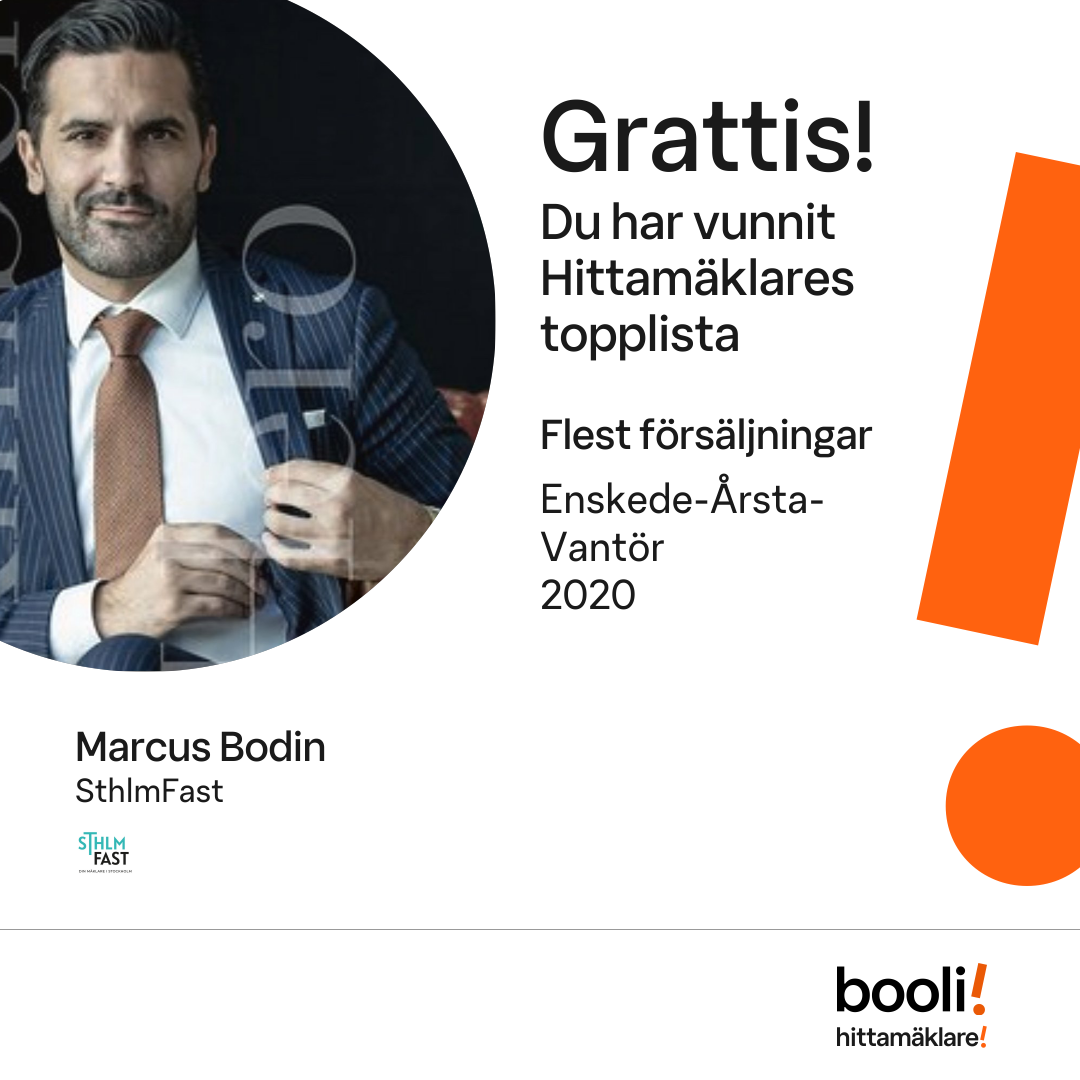 Statistik för publicerade bostäder, försäljningar och omdömen baseras på data från Booli och Hittamäklare. Statistiken för försäljningar avser inrapporterade och verifierade slutpriser från mäklare eller av Booli inhämtade och verifierade slutpriser. Statistiken för publicerade bostäder baseras på information som publicerats på Booli.se. Statistik för omdömen och rekommendationer baseras på omdömen från säljare som lämnats via Booli och Hittamäklare.