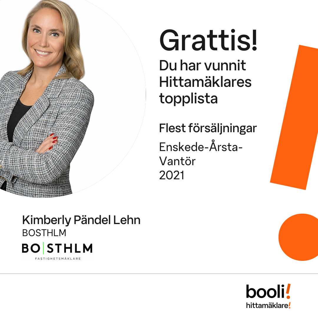 Statistik för publicerade bostäder, försäljningar och omdömen baseras på data från Booli och Hittamäklare. Statistiken för försäljningar avser inrapporterade och verifierade slutpriser från mäklare eller av Booli inhämtade och verifierade slutpriser. Statistiken för publicerade bostäder baseras på information som publicerats på Booli.se. Statistik för omdömen och rekommendationer baseras på omdömen från säljare som lämnats via Booli och Hittamäklare.