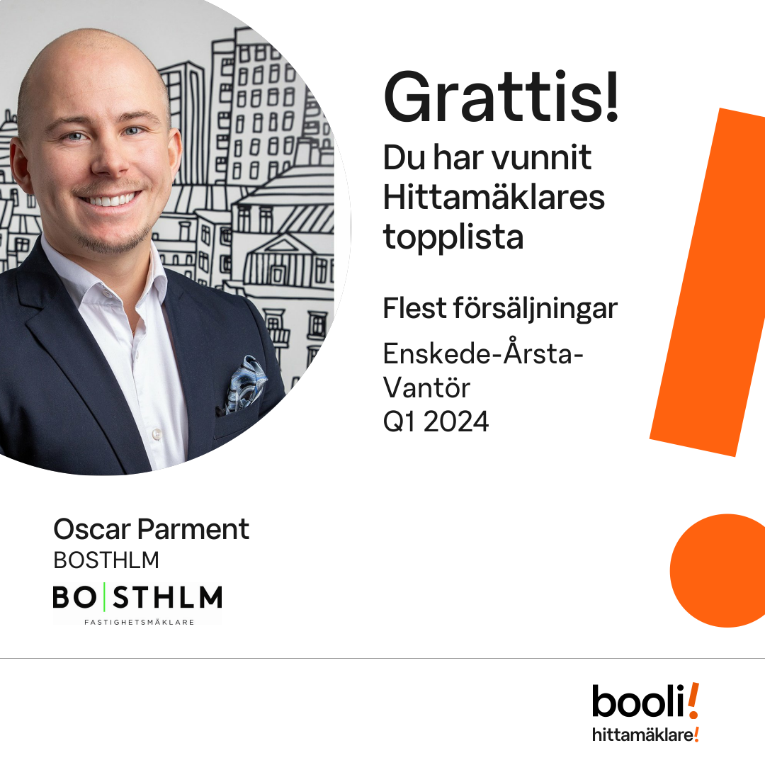 Statistik för publicerade bostäder, försäljningar och omdömen baseras på data från Booli och Hittamäklare. Statistiken för försäljningar avser inrapporterade och verifierade slutpriser från mäklare eller av Booli inhämtade och verifierade slutpriser. Statistiken för publicerade bostäder baseras på information som publicerats på Booli.se. Statistik för omdömen och rekommendationer baseras på omdömen från säljare som lämnats via Booli och Hittamäklare.