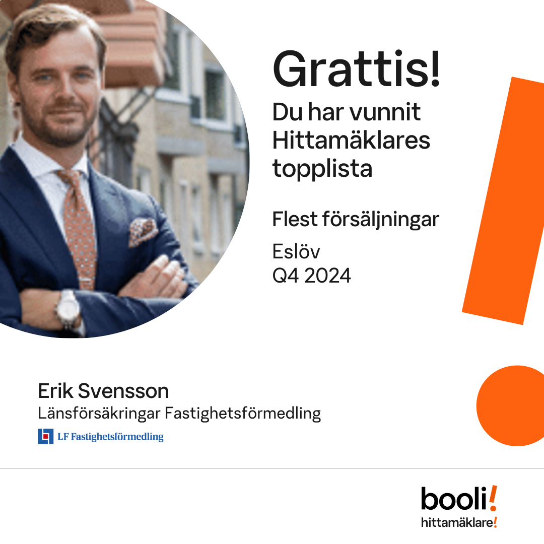 Statistik för publicerade bostäder, försäljningar och omdömen baseras på data från Booli och Hittamäklare. Statistiken för försäljningar avser inrapporterade och verifierade slutpriser från mäklare eller av Booli inhämtade och verifierade slutpriser. Statistiken för publicerade bostäder baseras på information som publicerats på Booli.se. Statistik för omdömen och rekommendationer baseras på omdömen från säljare som lämnats via Booli och Hittamäklare.