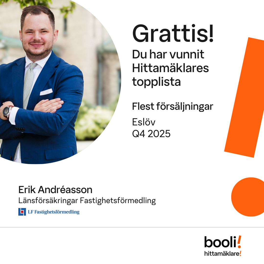 Statistik för publicerade bostäder, försäljningar och omdömen baseras på data från Booli och Hittamäklare. Statistiken för försäljningar avser inrapporterade och verifierade slutpriser från mäklare eller av Booli inhämtade och verifierade slutpriser. Statistiken för publicerade bostäder baseras på information som publicerats på Booli.se. Statistik för omdömen och rekommendationer baseras på omdömen från säljare som lämnats via Booli och Hittamäklare.