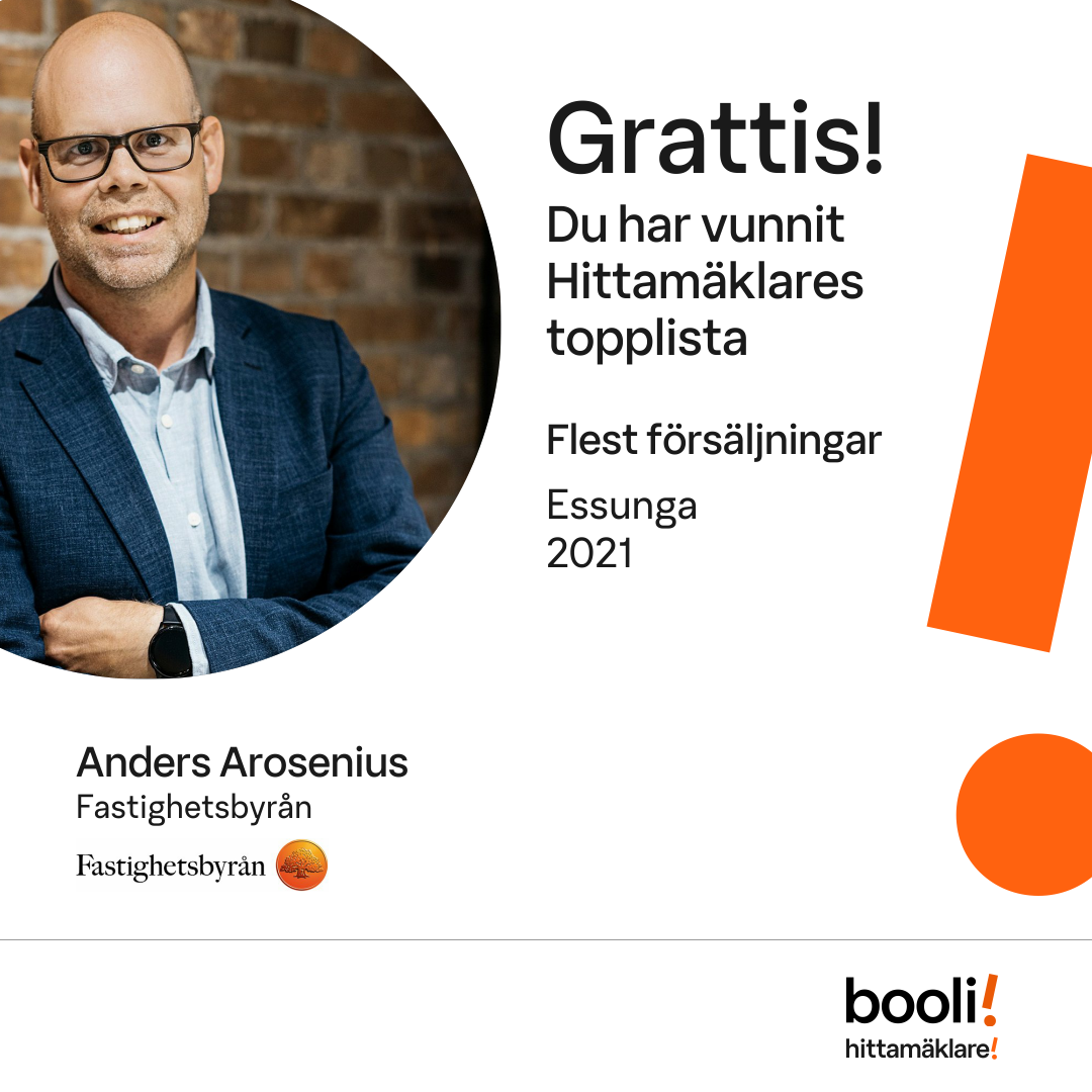 Statistik för publicerade bostäder, försäljningar och omdömen baseras på data från Booli och Hittamäklare. Statistiken för försäljningar avser inrapporterade och verifierade slutpriser från mäklare eller av Booli inhämtade och verifierade slutpriser. Statistiken för publicerade bostäder baseras på information som publicerats på Booli.se. Statistik för omdömen och rekommendationer baseras på omdömen från säljare som lämnats via Booli och Hittamäklare.