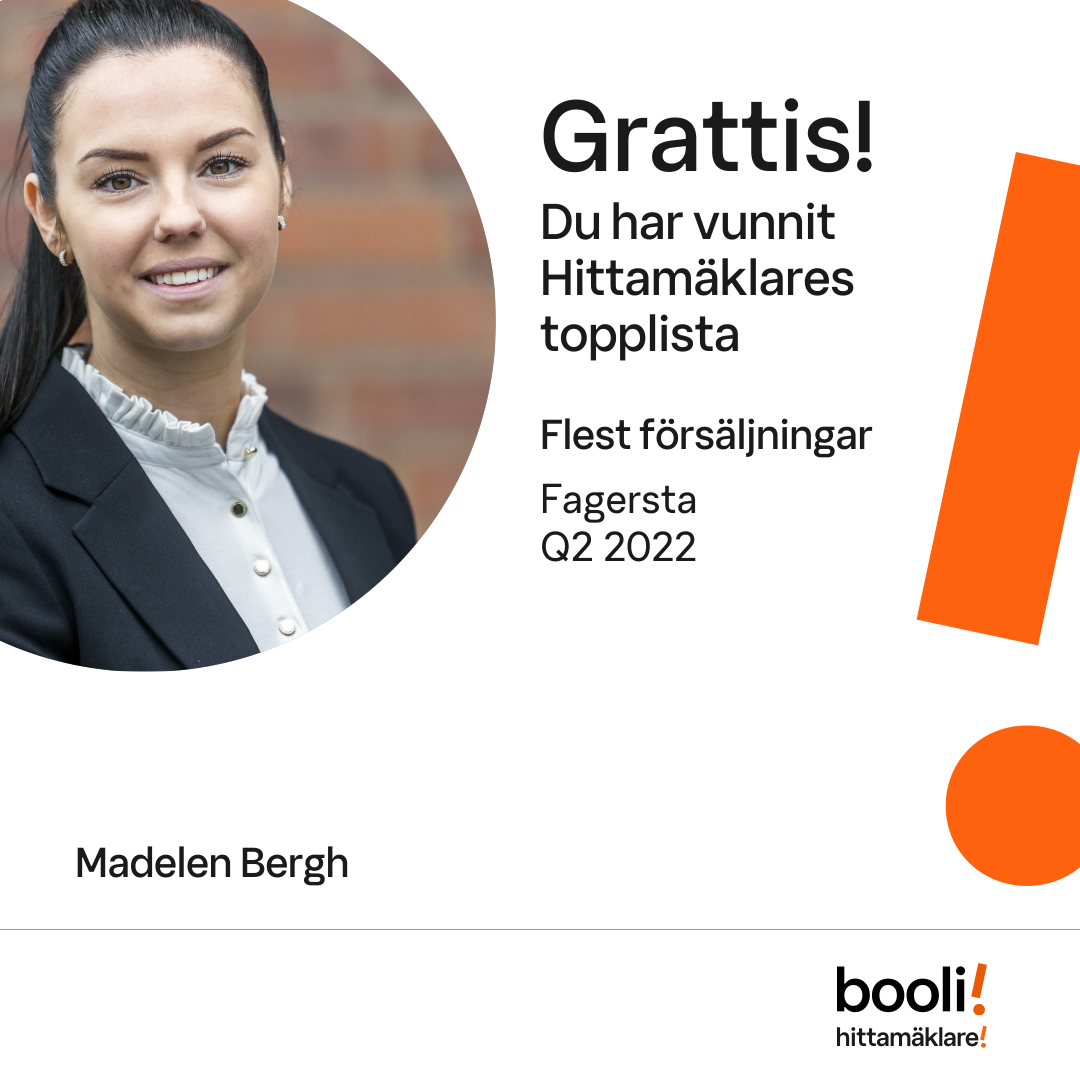 Statistik för publicerade bostäder, försäljningar och omdömen baseras på data från Booli och Hittamäklare. Statistiken för försäljningar avser inrapporterade och verifierade slutpriser från mäklare eller av Booli inhämtade och verifierade slutpriser. Statistiken för publicerade bostäder baseras på information som publicerats på Booli.se. Statistik för omdömen och rekommendationer baseras på omdömen från säljare som lämnats via Booli och Hittamäklare.