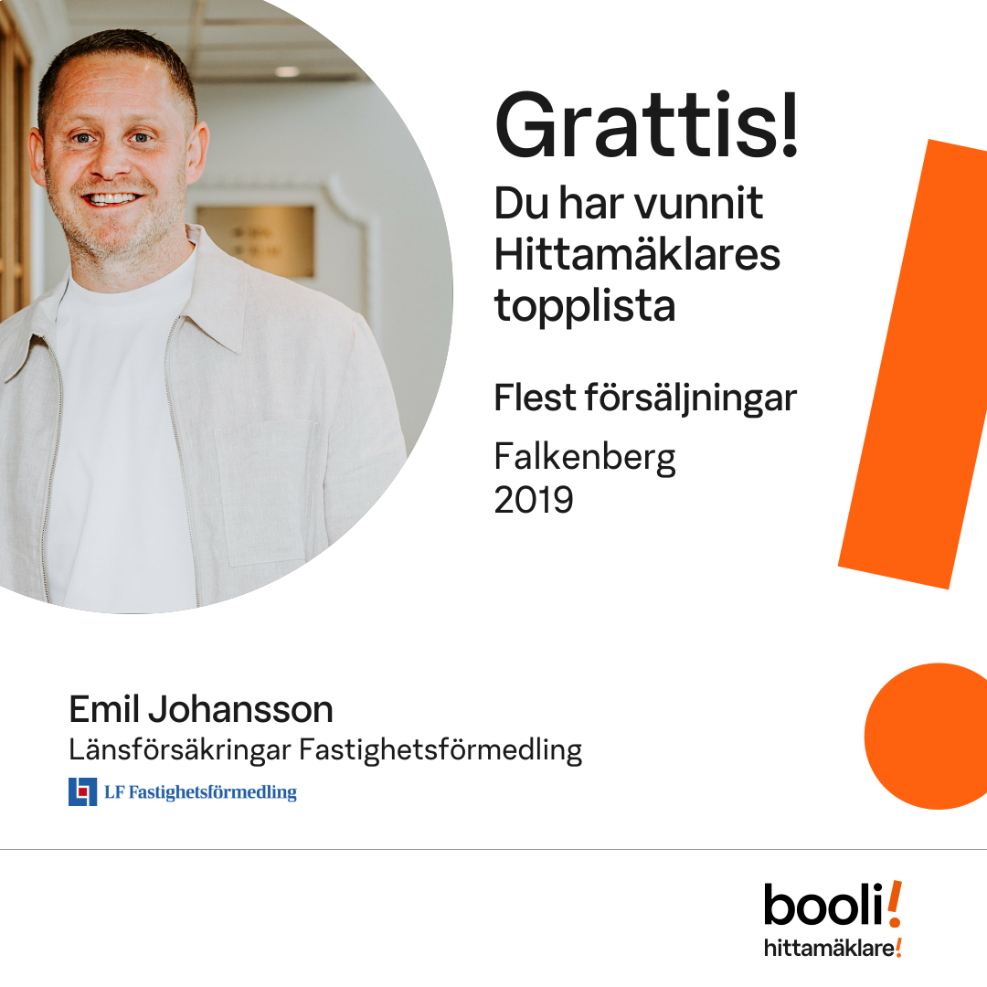 Statistik för publicerade bostäder, försäljningar och omdömen baseras på data från Booli och Hittamäklare. Statistiken för försäljningar avser inrapporterade och verifierade slutpriser från mäklare eller av Booli inhämtade och verifierade slutpriser. Statistiken för publicerade bostäder baseras på information som publicerats på Booli.se. Statistik för omdömen och rekommendationer baseras på omdömen från säljare som lämnats via Booli och Hittamäklare.