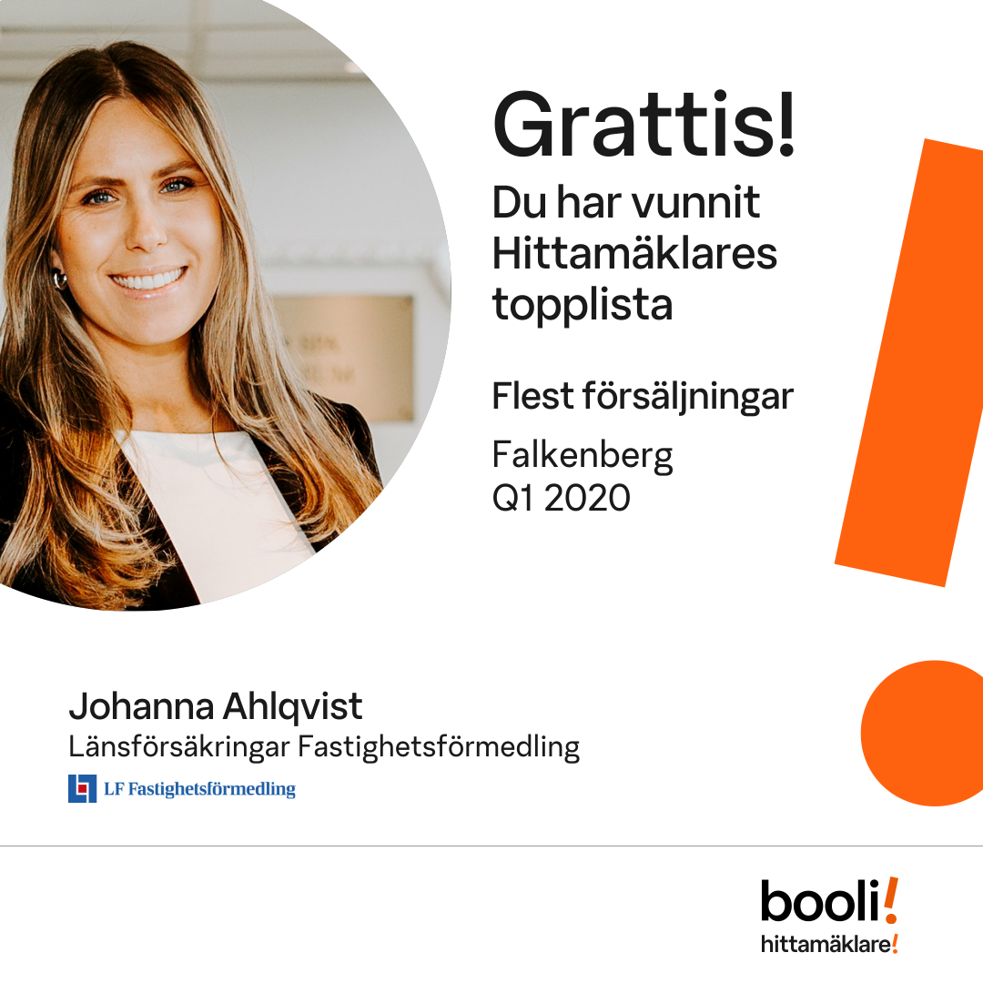 Statistik för publicerade bostäder, försäljningar och omdömen baseras på data från Booli och Hittamäklare. Statistiken för försäljningar avser inrapporterade och verifierade slutpriser från mäklare eller av Booli inhämtade och verifierade slutpriser. Statistiken för publicerade bostäder baseras på information som publicerats på Booli.se. Statistik för omdömen och rekommendationer baseras på omdömen från säljare som lämnats via Booli och Hittamäklare.