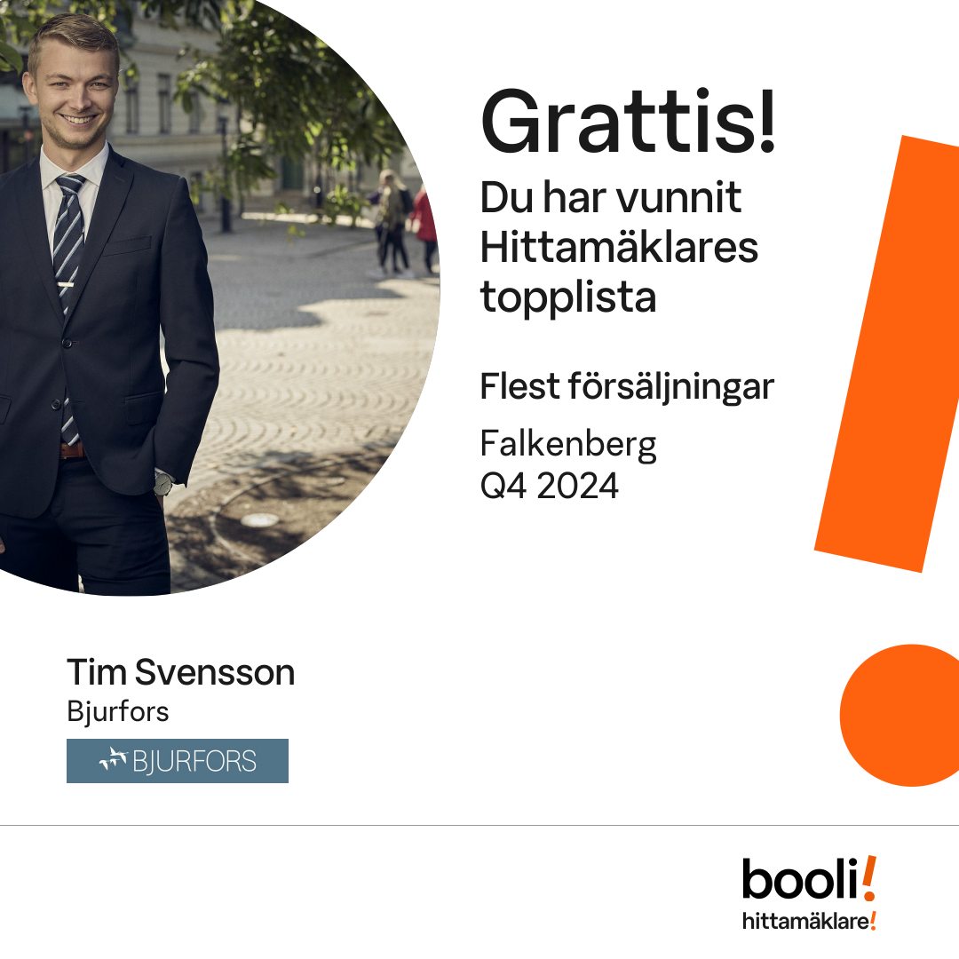 Statistik för publicerade bostäder, försäljningar och omdömen baseras på data från Booli och Hittamäklare. Statistiken för försäljningar avser inrapporterade och verifierade slutpriser från mäklare eller av Booli inhämtade och verifierade slutpriser. Statistiken för publicerade bostäder baseras på information som publicerats på Booli.se. Statistik för omdömen och rekommendationer baseras på omdömen från säljare som lämnats via Booli och Hittamäklare.