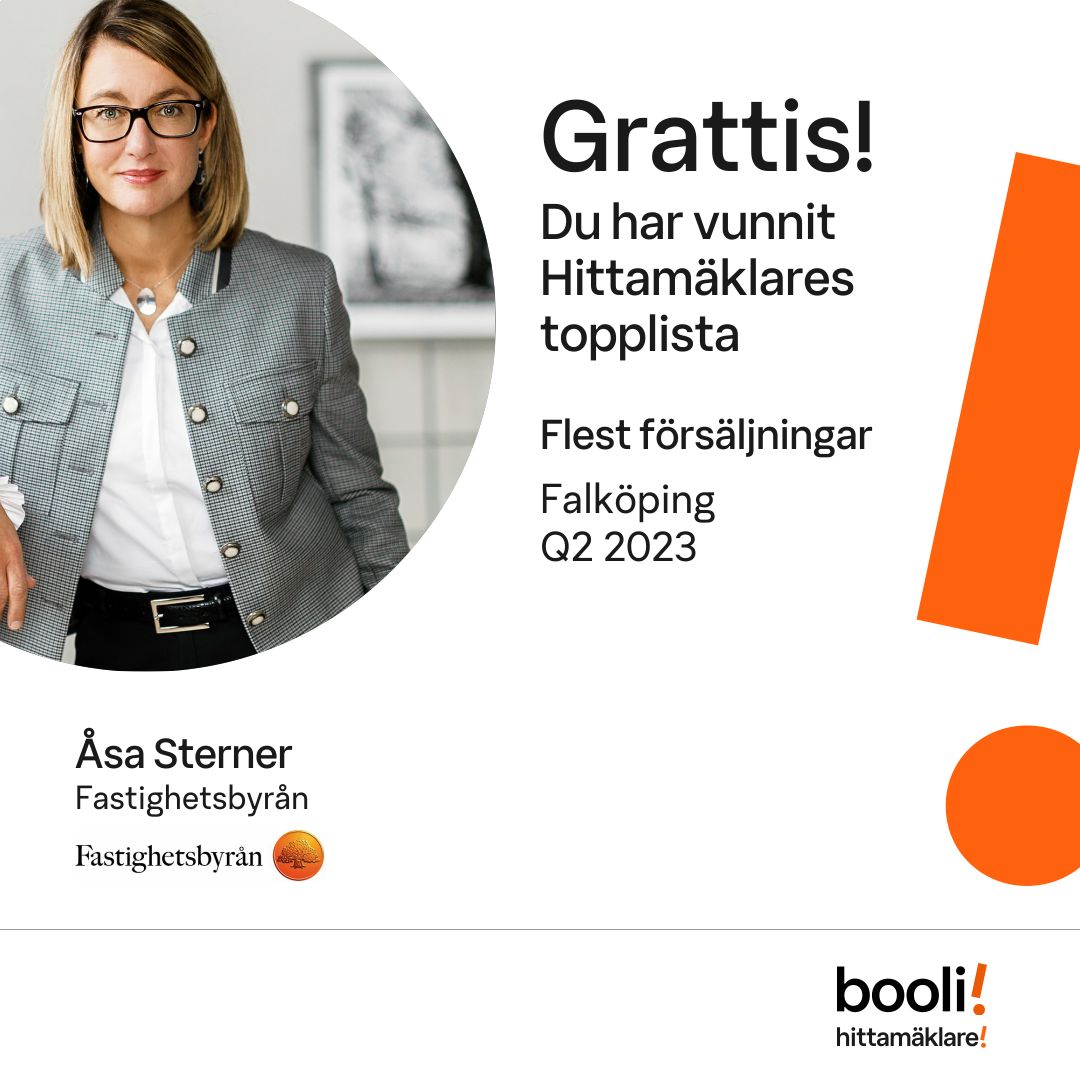 Statistik för publicerade bostäder, försäljningar och omdömen baseras på data från Booli och Hittamäklare. Statistiken för försäljningar avser inrapporterade och verifierade slutpriser från mäklare eller av Booli inhämtade och verifierade slutpriser. Statistiken för publicerade bostäder baseras på information som publicerats på Booli.se. Statistik för omdömen och rekommendationer baseras på omdömen från säljare som lämnats via Booli och Hittamäklare.