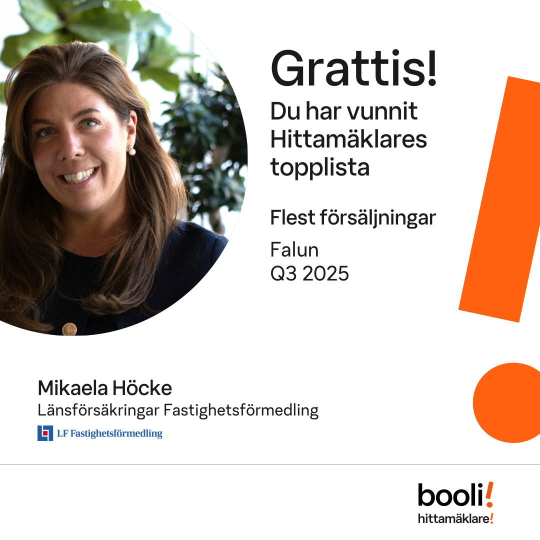Statistik för publicerade bostäder, försäljningar och omdömen baseras på data från Booli och Hittamäklare. Statistiken för försäljningar avser inrapporterade och verifierade slutpriser från mäklare eller av Booli inhämtade och verifierade slutpriser. Statistiken för publicerade bostäder baseras på information som publicerats på Booli.se. Statistik för omdömen och rekommendationer baseras på omdömen från säljare som lämnats via Booli och Hittamäklare.
