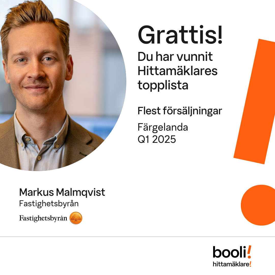 Statistik för publicerade bostäder, försäljningar och omdömen baseras på data från Booli och Hittamäklare. Statistiken för försäljningar avser inrapporterade och verifierade slutpriser från mäklare eller av Booli inhämtade och verifierade slutpriser. Statistiken för publicerade bostäder baseras på information som publicerats på Booli.se. Statistik för omdömen och rekommendationer baseras på omdömen från säljare som lämnats via Booli och Hittamäklare.