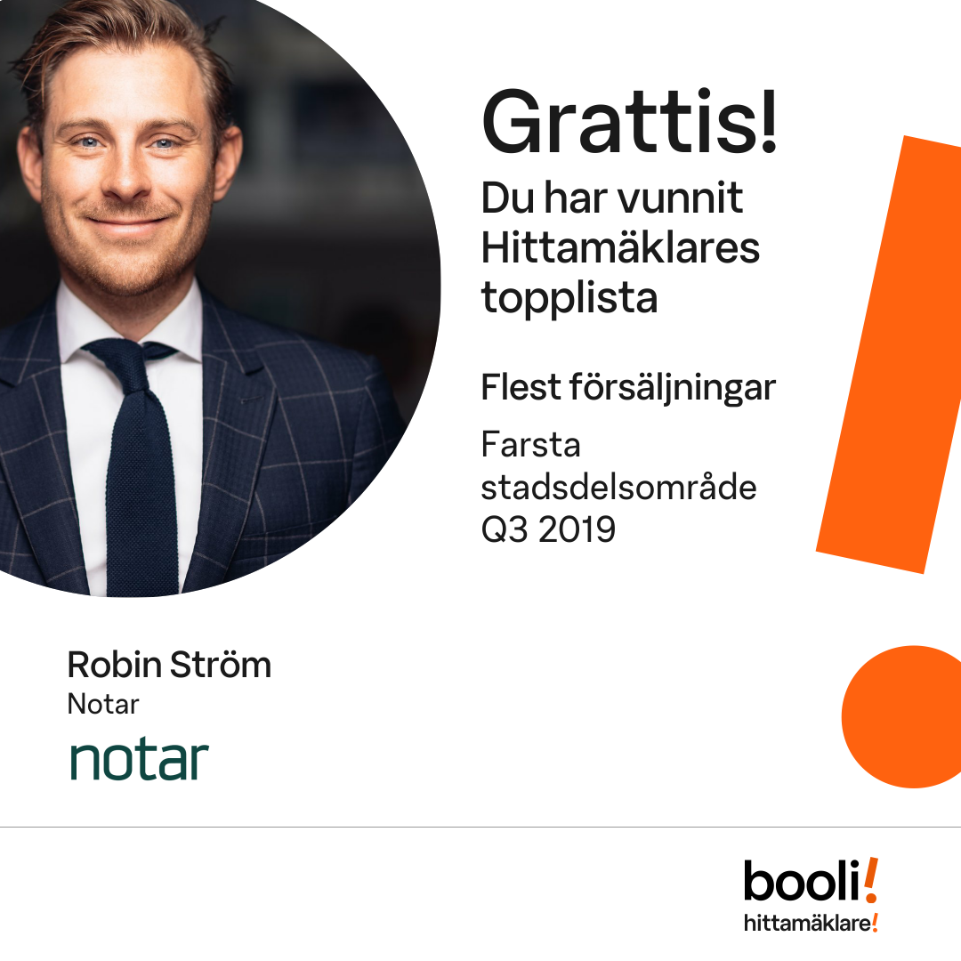 Statistik för publicerade bostäder, försäljningar och omdömen baseras på data från Booli och Hittamäklare. Statistiken för försäljningar avser inrapporterade och verifierade slutpriser från mäklare eller av Booli inhämtade och verifierade slutpriser. Statistiken för publicerade bostäder baseras på information som publicerats på Booli.se. Statistik för omdömen och rekommendationer baseras på omdömen från säljare som lämnats via Booli och Hittamäklare.