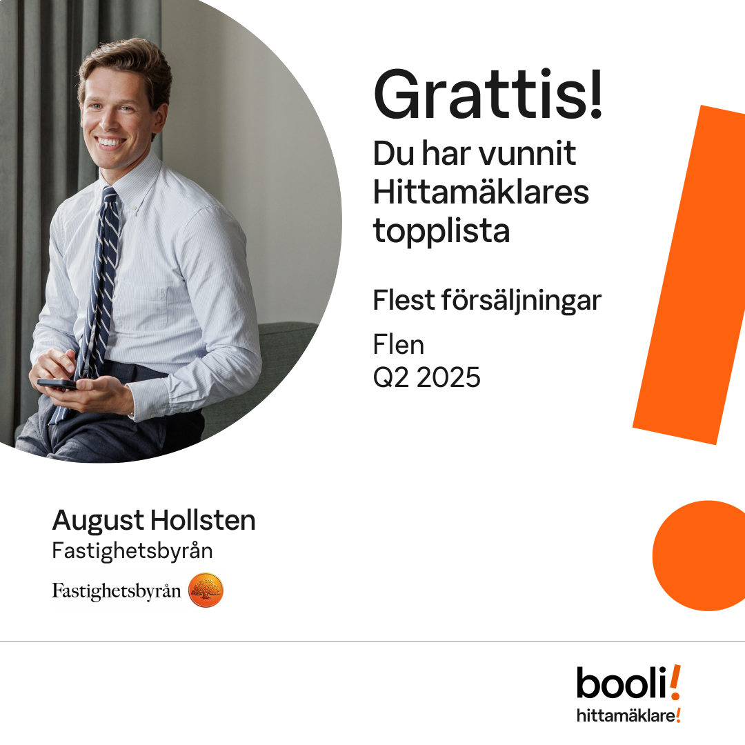 Statistik för publicerade bostäder, försäljningar och omdömen baseras på data från Booli och Hittamäklare. Statistiken för försäljningar avser inrapporterade och verifierade slutpriser från mäklare eller av Booli inhämtade och verifierade slutpriser. Statistiken för publicerade bostäder baseras på information som publicerats på Booli.se. Statistik för omdömen och rekommendationer baseras på omdömen från säljare som lämnats via Booli och Hittamäklare.