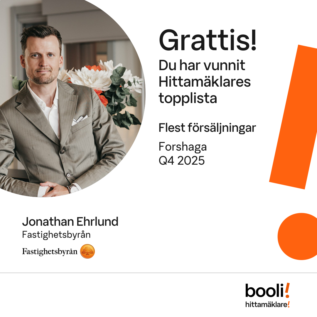 Statistik för publicerade bostäder, försäljningar och omdömen baseras på data från Booli och Hittamäklare. Statistiken för försäljningar avser inrapporterade och verifierade slutpriser från mäklare eller av Booli inhämtade och verifierade slutpriser. Statistiken för publicerade bostäder baseras på information som publicerats på Booli.se. Statistik för omdömen och rekommendationer baseras på omdömen från säljare som lämnats via Booli och Hittamäklare.