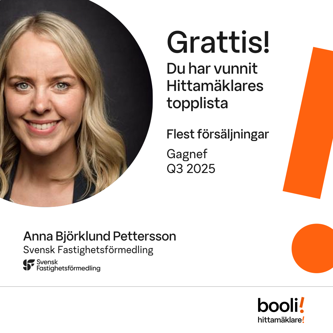 Statistik för publicerade bostäder, försäljningar och omdömen baseras på data från Booli och Hittamäklare. Statistiken för försäljningar avser inrapporterade och verifierade slutpriser från mäklare eller av Booli inhämtade och verifierade slutpriser. Statistiken för publicerade bostäder baseras på information som publicerats på Booli.se. Statistik för omdömen och rekommendationer baseras på omdömen från säljare som lämnats via Booli och Hittamäklare.