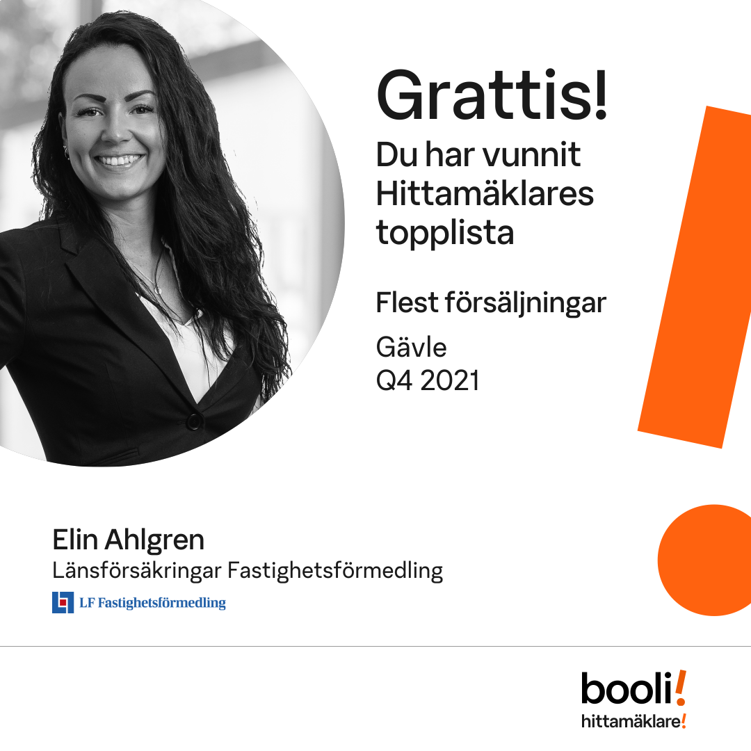 Statistik för publicerade bostäder, försäljningar och omdömen baseras på data från Booli och Hittamäklare. Statistiken för försäljningar avser inrapporterade och verifierade slutpriser från mäklare eller av Booli inhämtade och verifierade slutpriser. Statistiken för publicerade bostäder baseras på information som publicerats på Booli.se. Statistik för omdömen och rekommendationer baseras på omdömen från säljare som lämnats via Booli och Hittamäklare.