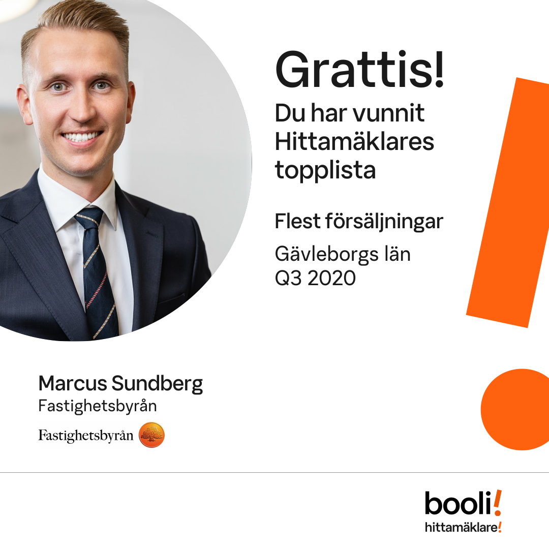 Statistik för publicerade bostäder, försäljningar och omdömen baseras på data från Booli och Hittamäklare. Statistiken för försäljningar avser inrapporterade och verifierade slutpriser från mäklare eller av Booli inhämtade och verifierade slutpriser. Statistiken för publicerade bostäder baseras på information som publicerats på Booli.se. Statistik för omdömen och rekommendationer baseras på omdömen från säljare som lämnats via Booli och Hittamäklare.