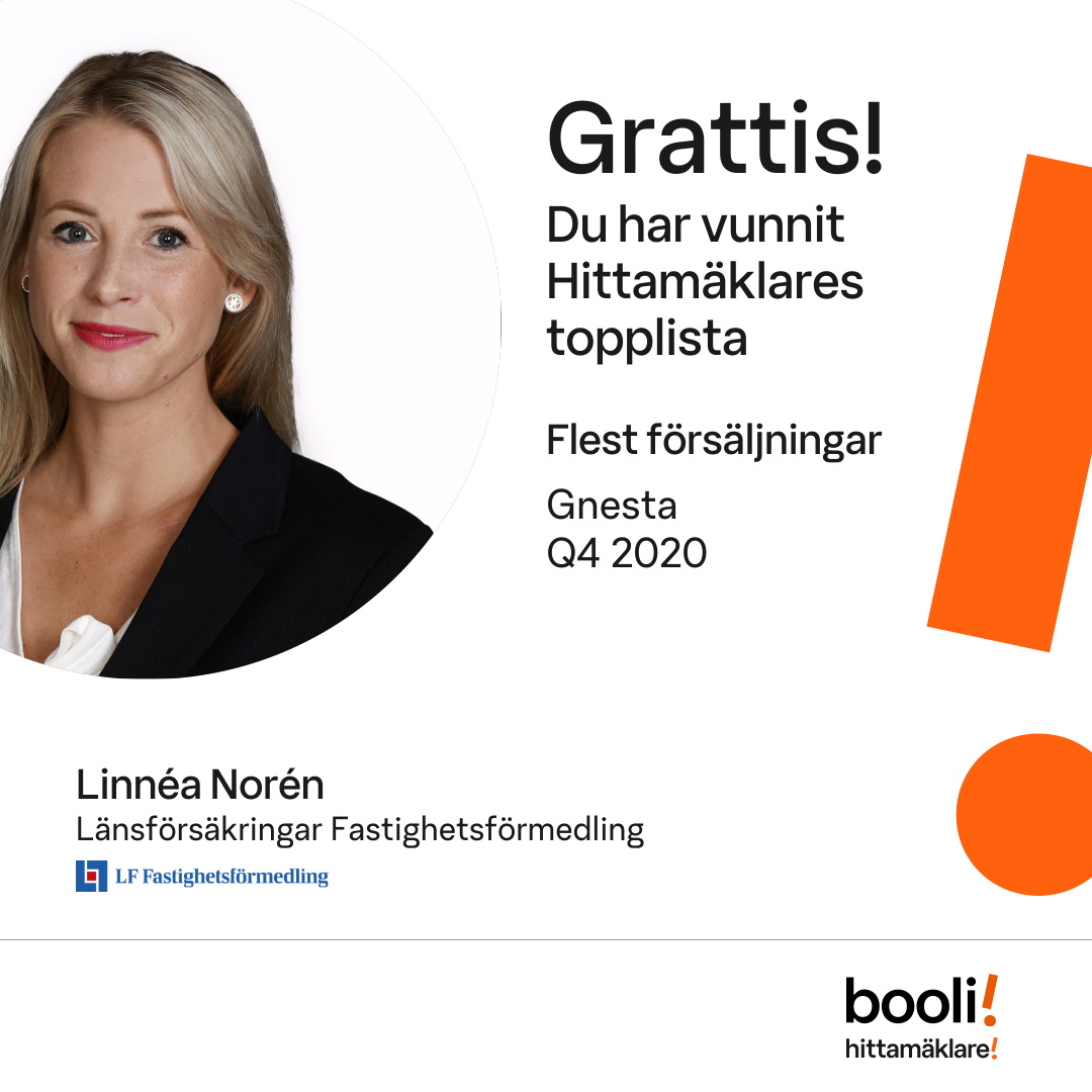 Statistik för publicerade bostäder, försäljningar och omdömen baseras på data från Booli och Hittamäklare. Statistiken för försäljningar avser inrapporterade och verifierade slutpriser från mäklare eller av Booli inhämtade och verifierade slutpriser. Statistiken för publicerade bostäder baseras på information som publicerats på Booli.se. Statistik för omdömen och rekommendationer baseras på omdömen från säljare som lämnats via Booli och Hittamäklare.