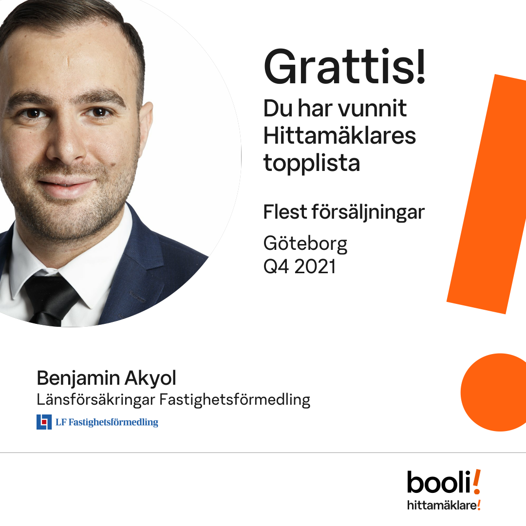 Statistik för publicerade bostäder, försäljningar och omdömen baseras på data från Booli och Hittamäklare. Statistiken för försäljningar avser inrapporterade och verifierade slutpriser från mäklare eller av Booli inhämtade och verifierade slutpriser. Statistiken för publicerade bostäder baseras på information som publicerats på Booli.se. Statistik för omdömen och rekommendationer baseras på omdömen från säljare som lämnats via Booli och Hittamäklare.