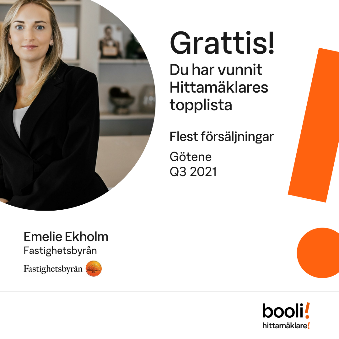 Statistik för publicerade bostäder, försäljningar och omdömen baseras på data från Booli och Hittamäklare. Statistiken för försäljningar avser inrapporterade och verifierade slutpriser från mäklare eller av Booli inhämtade och verifierade slutpriser. Statistiken för publicerade bostäder baseras på information som publicerats på Booli.se. Statistik för omdömen och rekommendationer baseras på omdömen från säljare som lämnats via Booli och Hittamäklare.
