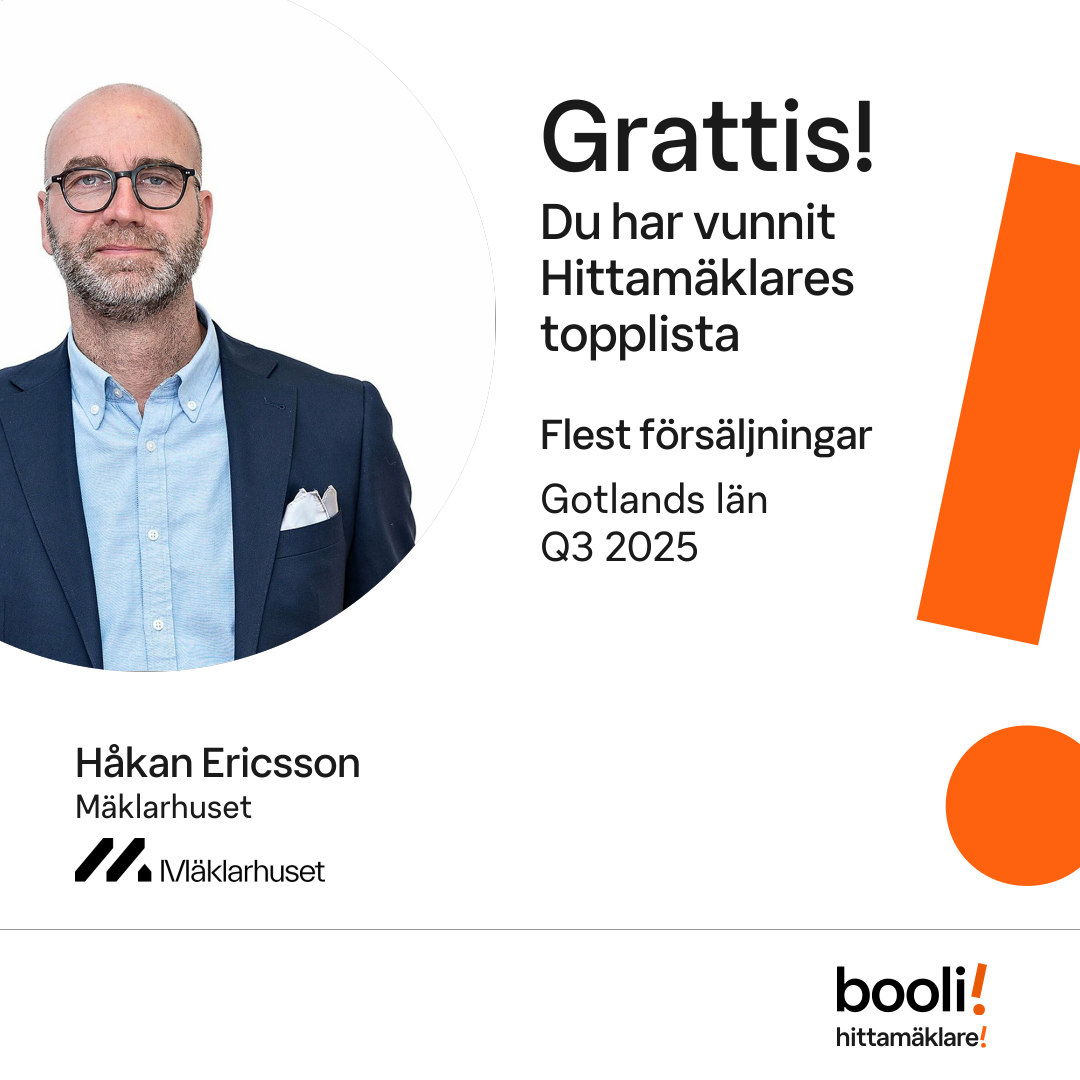 Statistik för publicerade bostäder, försäljningar och omdömen baseras på data från Booli och Hittamäklare. Statistiken för försäljningar avser inrapporterade och verifierade slutpriser från mäklare eller av Booli inhämtade och verifierade slutpriser. Statistiken för publicerade bostäder baseras på information som publicerats på Booli.se. Statistik för omdömen och rekommendationer baseras på omdömen från säljare som lämnats via Booli och Hittamäklare.