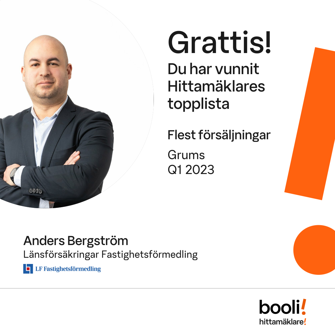 Statistik för publicerade bostäder, försäljningar och omdömen baseras på data från Booli och Hittamäklare. Statistiken för försäljningar avser inrapporterade och verifierade slutpriser från mäklare eller av Booli inhämtade och verifierade slutpriser. Statistiken för publicerade bostäder baseras på information som publicerats på Booli.se. Statistik för omdömen och rekommendationer baseras på omdömen från säljare som lämnats via Booli och Hittamäklare.