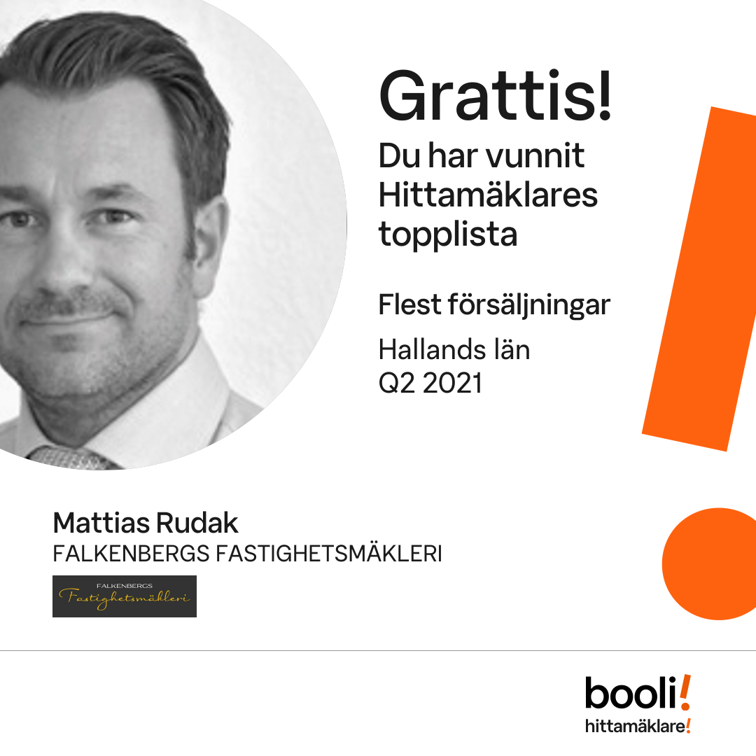 Statistik för publicerade bostäder, försäljningar och omdömen baseras på data från Booli och Hittamäklare. Statistiken för försäljningar avser inrapporterade och verifierade slutpriser från mäklare eller av Booli inhämtade och verifierade slutpriser. Statistiken för publicerade bostäder baseras på information som publicerats på Booli.se. Statistik för omdömen och rekommendationer baseras på omdömen från säljare som lämnats via Booli och Hittamäklare.