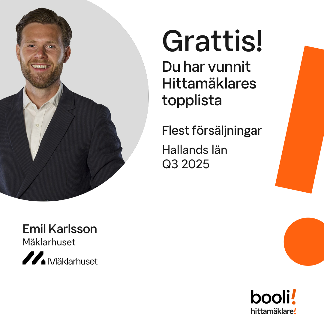 Statistik för publicerade bostäder, försäljningar och omdömen baseras på data från Booli och Hittamäklare. Statistiken för försäljningar avser inrapporterade och verifierade slutpriser från mäklare eller av Booli inhämtade och verifierade slutpriser. Statistiken för publicerade bostäder baseras på information som publicerats på Booli.se. Statistik för omdömen och rekommendationer baseras på omdömen från säljare som lämnats via Booli och Hittamäklare.