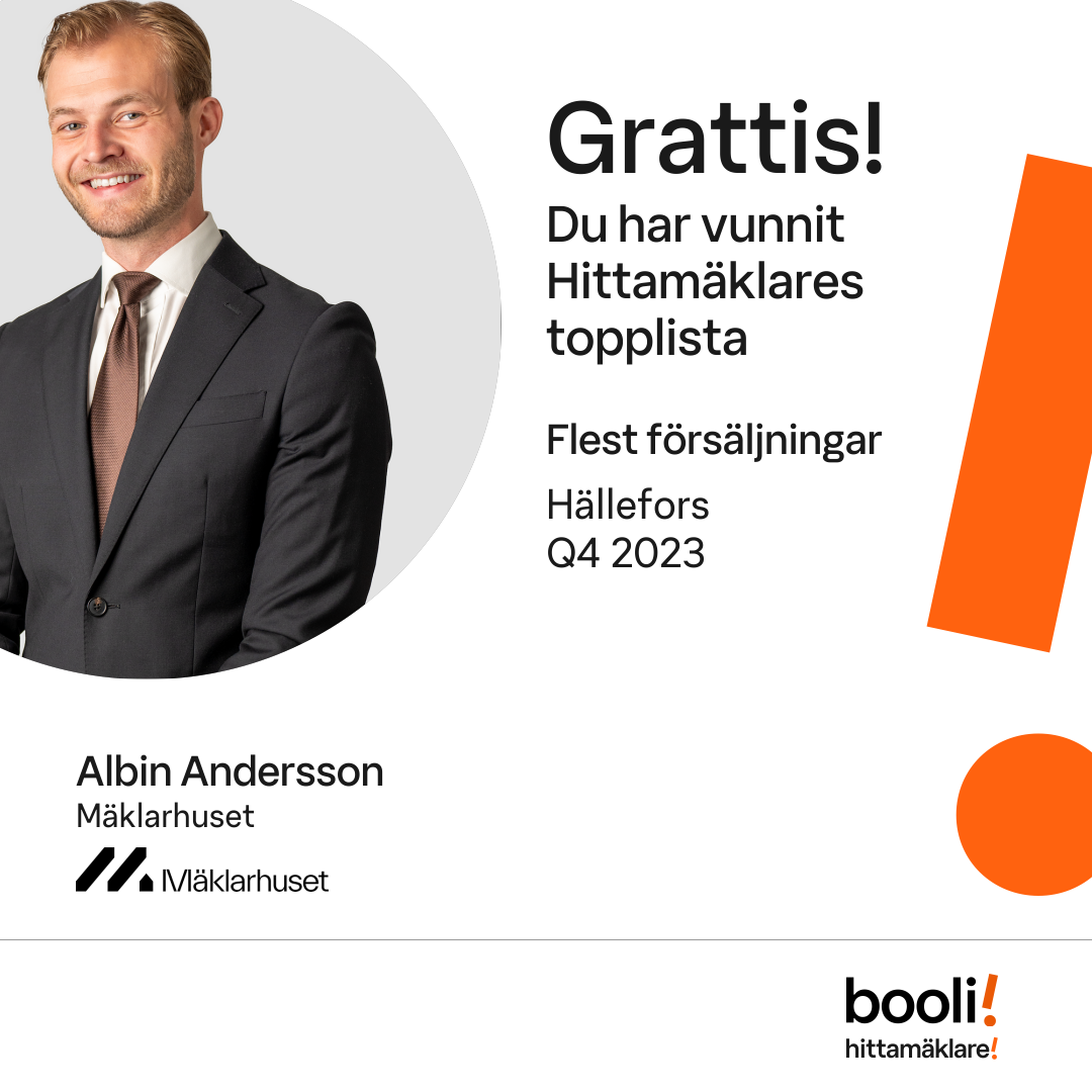 Statistik för publicerade bostäder, försäljningar och omdömen baseras på data från Booli och Hittamäklare. Statistiken för försäljningar avser inrapporterade och verifierade slutpriser från mäklare eller av Booli inhämtade och verifierade slutpriser. Statistiken för publicerade bostäder baseras på information som publicerats på Booli.se. Statistik för omdömen och rekommendationer baseras på omdömen från säljare som lämnats via Booli och Hittamäklare.
